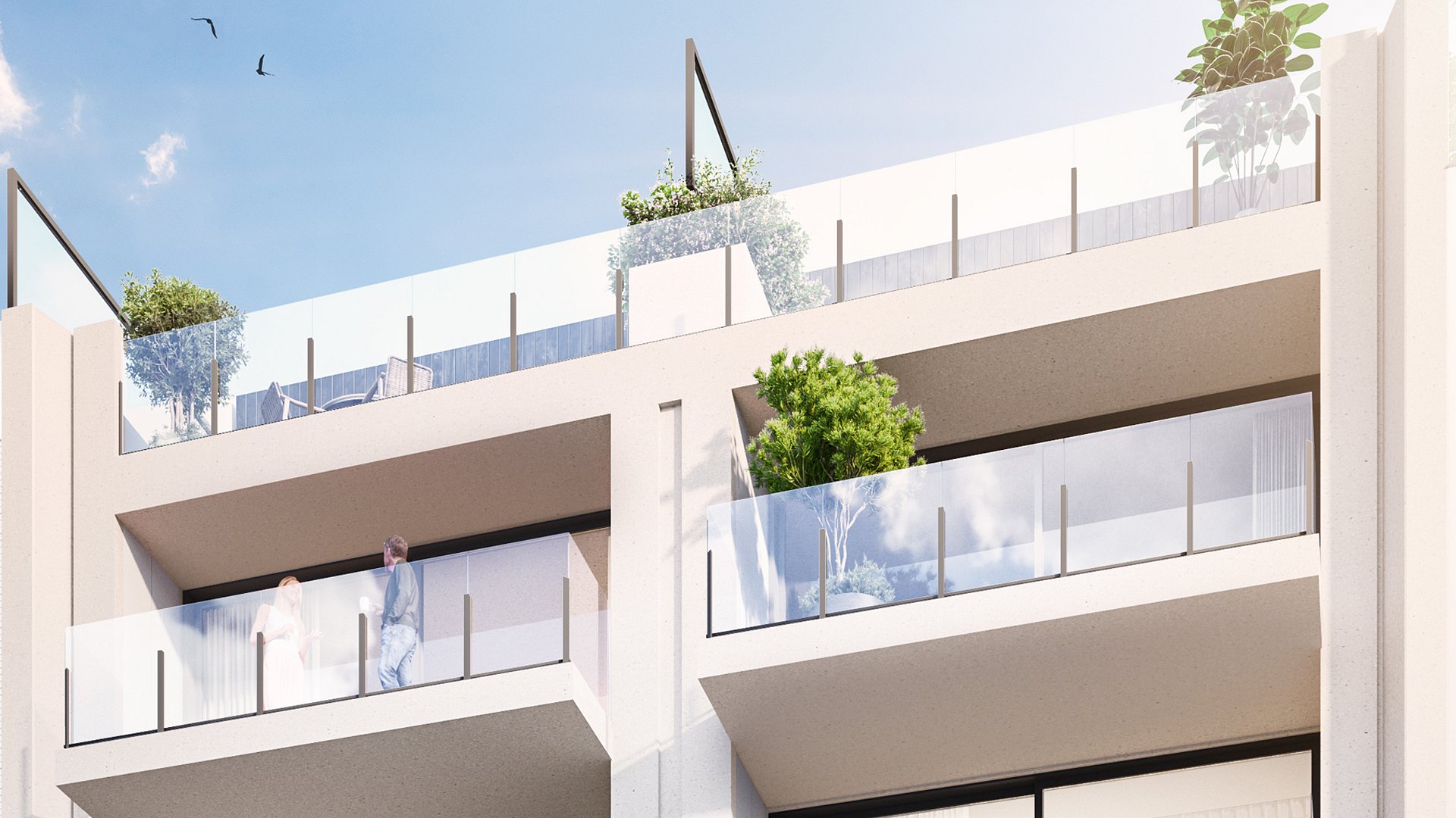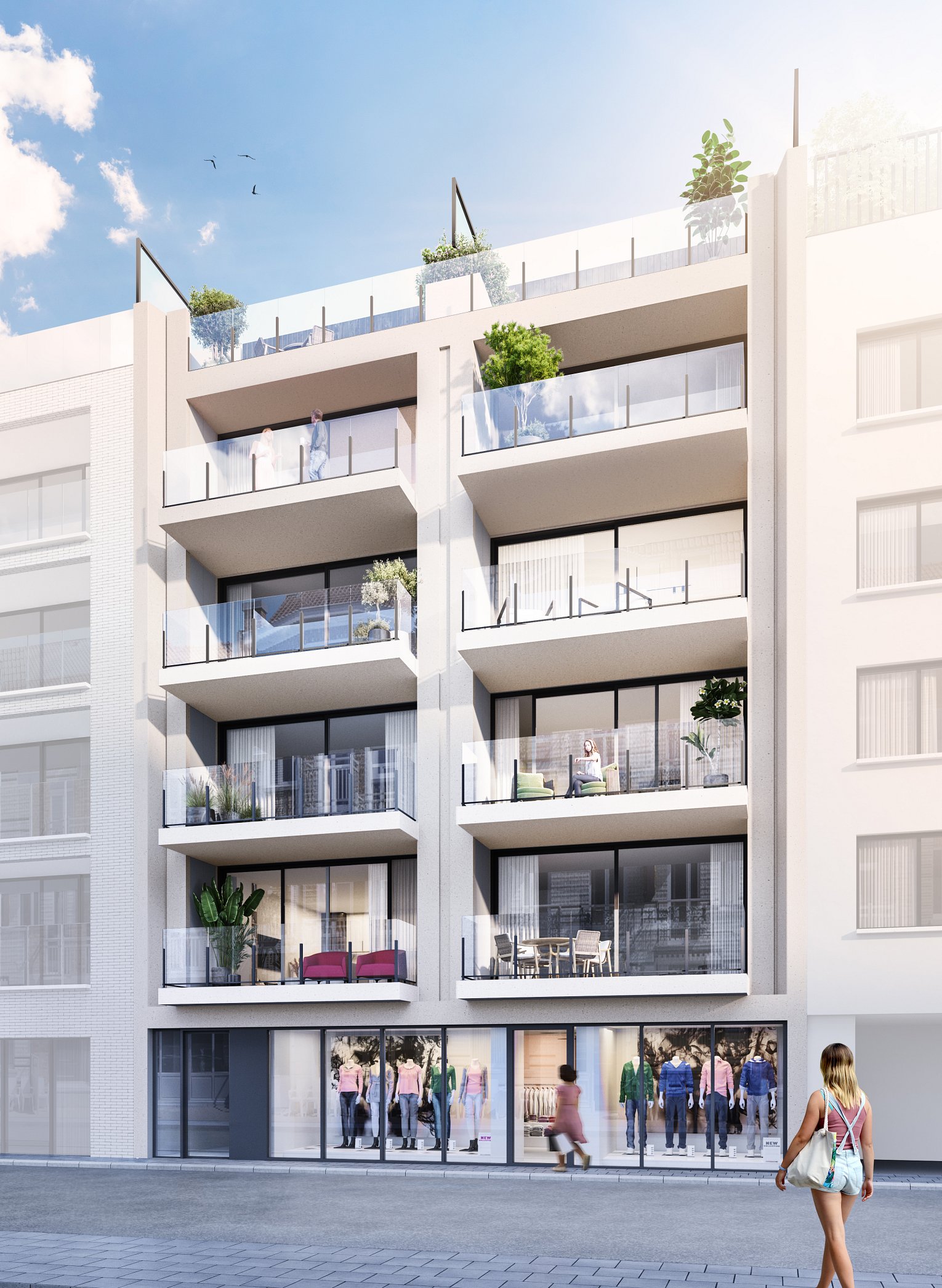 De strakke en frisse architecturale uitstraling van de bovenliggende verdiepingen creëert een kwalitatieve vernieuwing van het straatbeeld. Alle appartementen worden voorzien van ruime zongerichte leefterrassen aan de voorgevel. Op de technische verdieping komen er 2 kleinere studio’s met tevens grote terrassen.