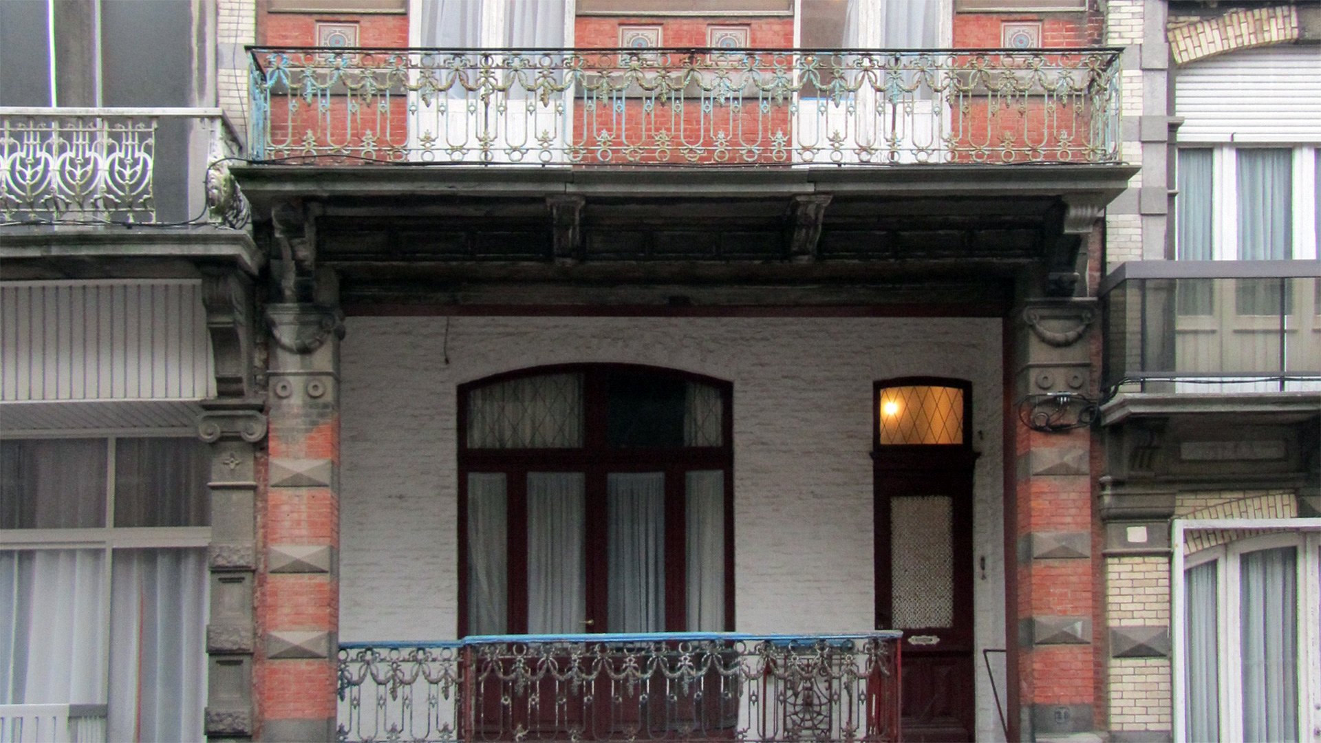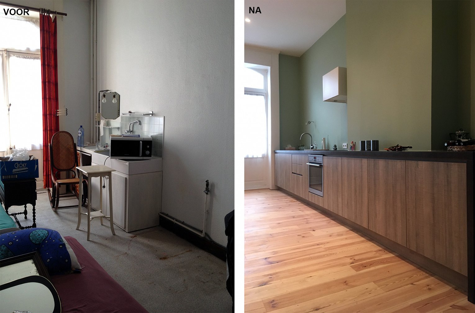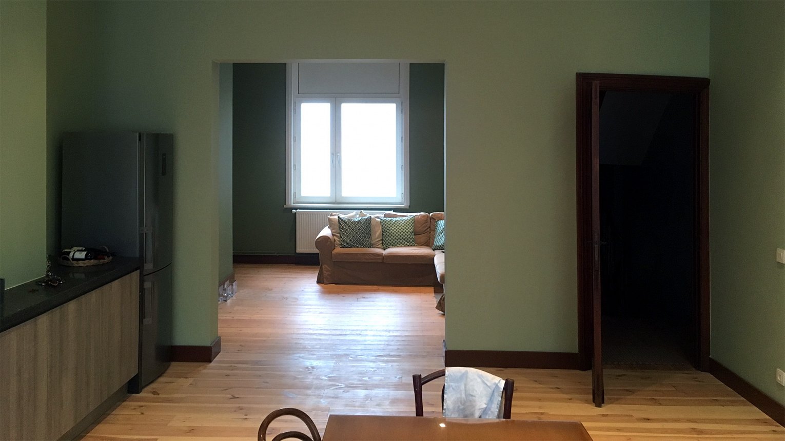 De woning is gelegen tegenover de Sint Rochuskerk. De schaduw van het kerkgebouw zorgt ervoor dat de woning op de gelijkvloerse verdieping erg donker is. Daarom werd geopteerd om de leefruimte op de eerste verdieping onder te brengen. De grote open ruimte werd gerestaureerd. De plankenvloer werd zichtbaar gemaakt, het plafond werd gerestaureerd en een lang laag meubel wordt gebruikt als keuken.