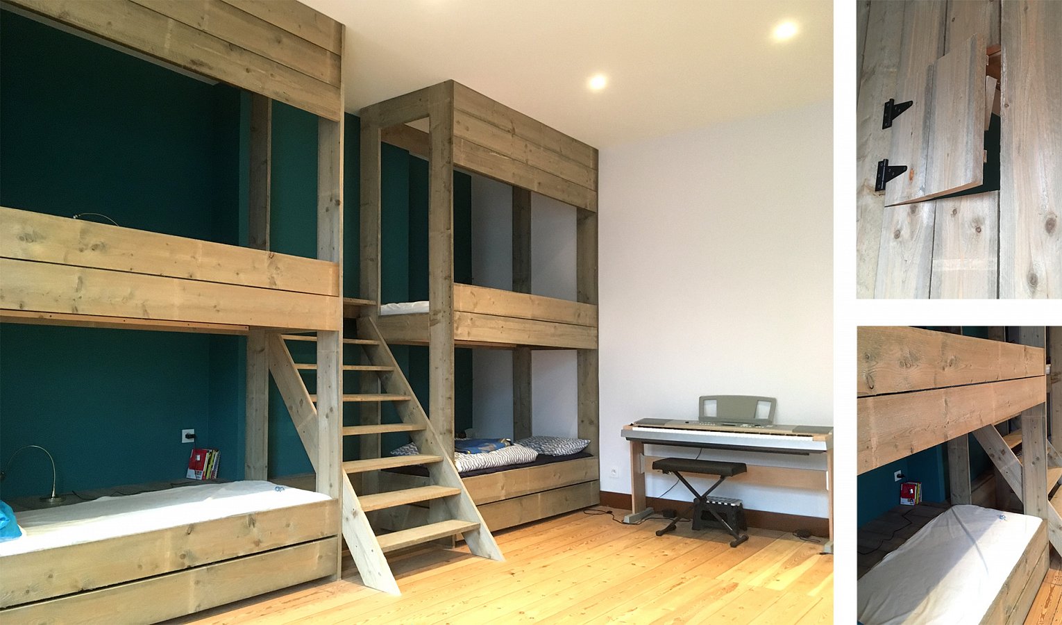 De slaapkamers bevinden zich op de 2e en 3e verdieping. De kinderkamer is ingericht met steigerhouten stapelbedden. Zo kunnen zes kinderen samen in hun eigen leefwereld slapen.