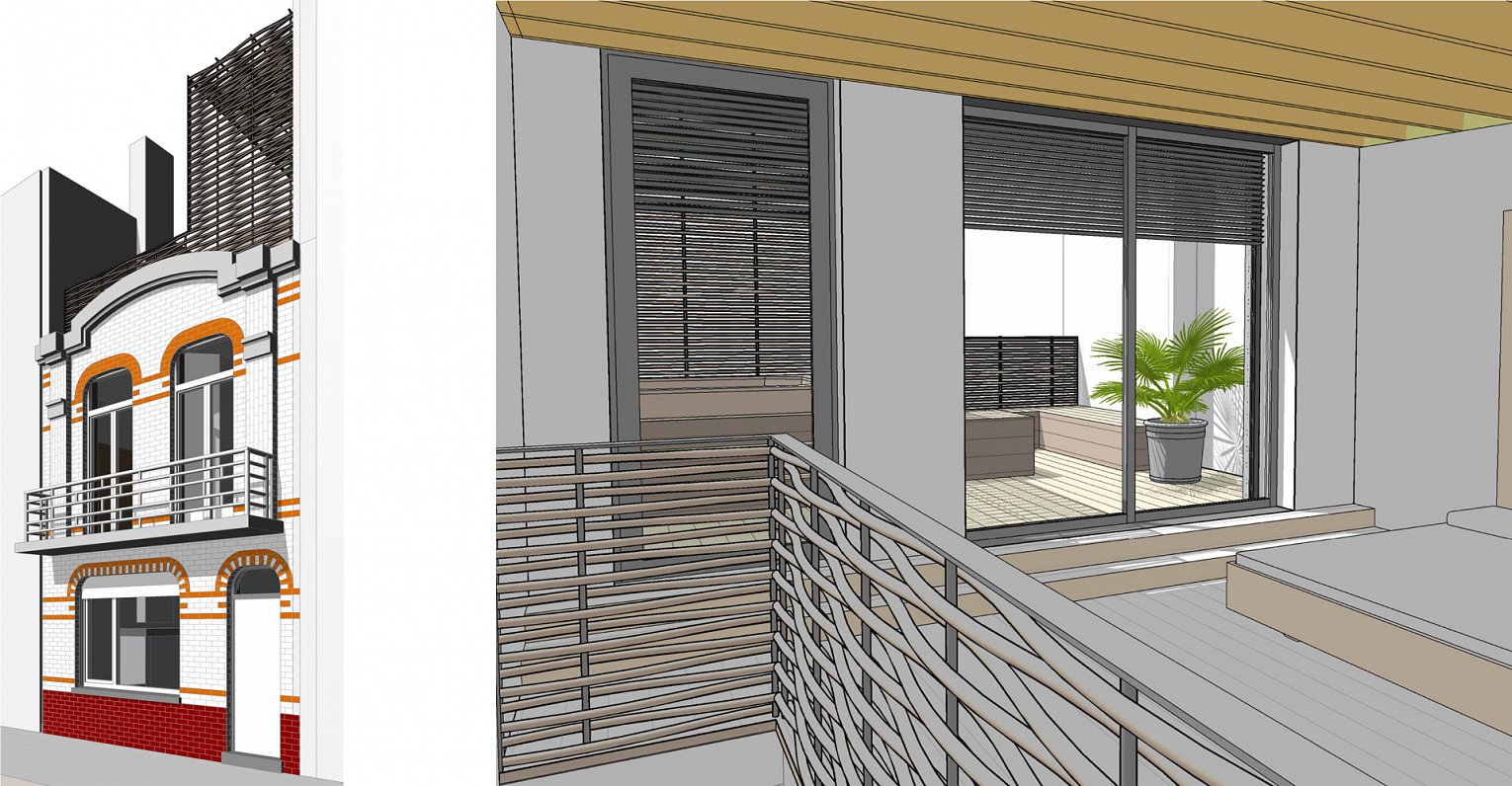 Op een bestaande rijwoning creëren we een extra dakverdieping met aangename dakterrassen aan zowel voor- als achterzijde.