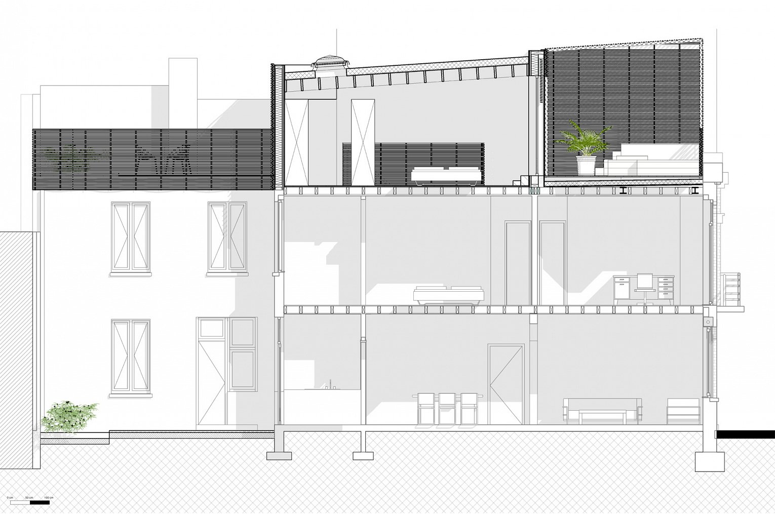 Het plat dak van de achterbouw wordt nu tevens benut als dakterras + daktuintje, waarmee we een aanzet naar de omgeving willen geven om de dichtgeslibte binnengebieden terug aangenaam en leefbaar te maken.