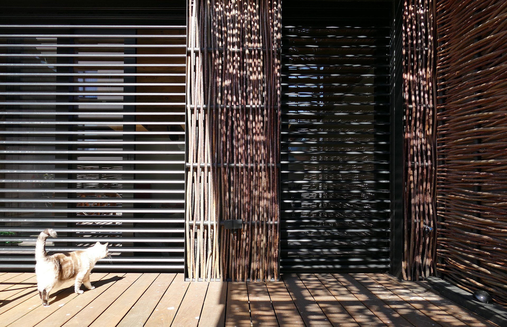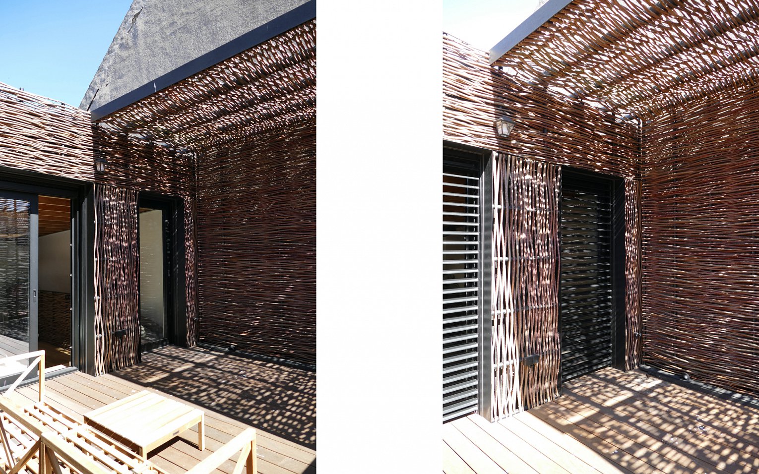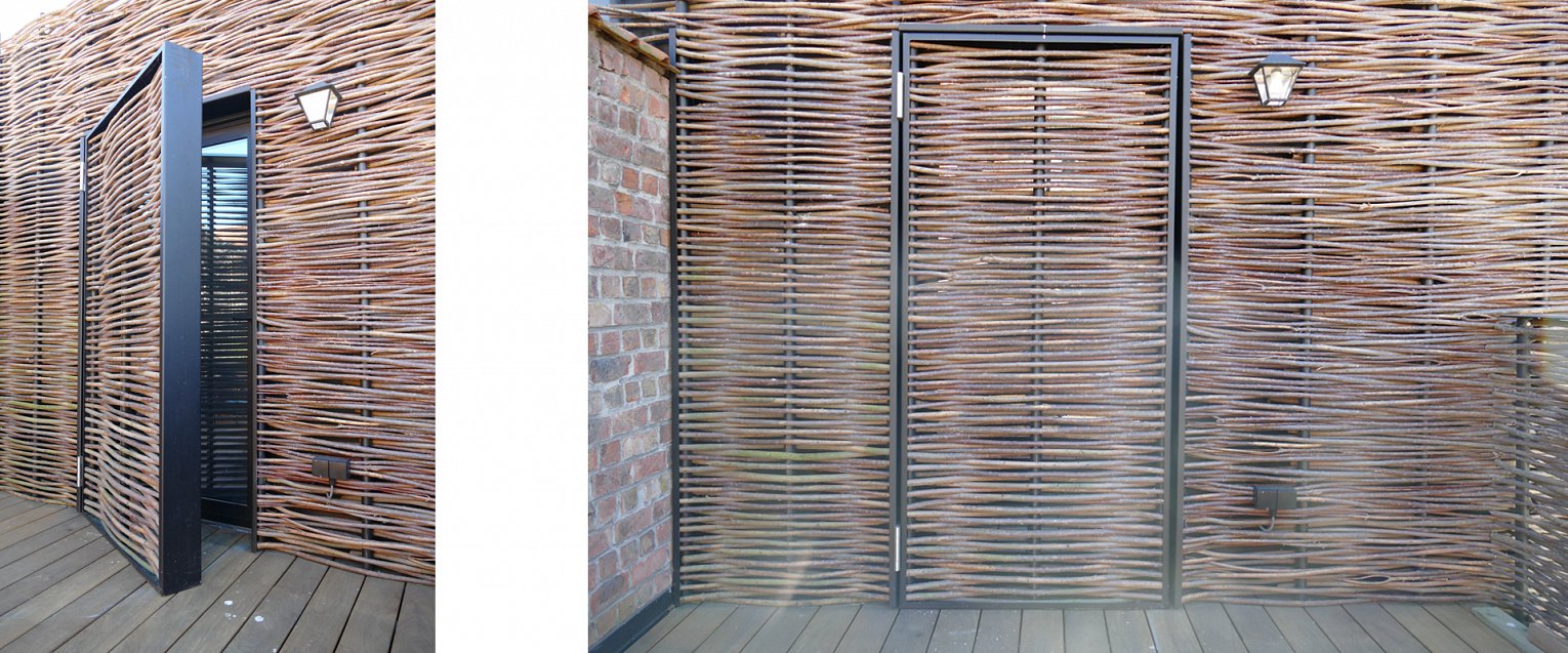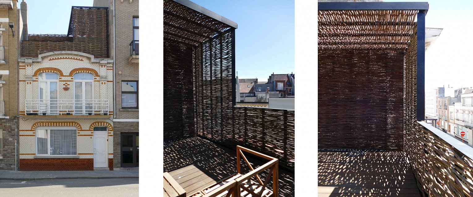 Het toegevoegde volume wordt vervaardigd in een lichte houtskeletstructuur. Als materiaalgebruik voor de gevelbekleding wordt hier geopteerd voor een geweven houtbekleding, waarbij de link wordt gelegd naar een ‘vogelnest’ gebouwd op een bestaande constructie. Hierdoor ontstaat een contrast met de bestaande ‘Belle Epoque’ gevel, waardoor deze zelfs in zijn authenticiteit versterkt wordt. Dit materiaal wordt consequent doorgetrokken over de volledige toegevoegde bouwlaag.