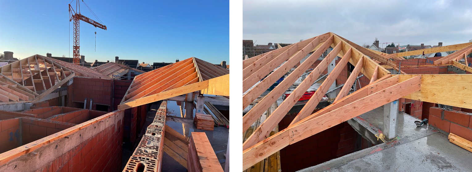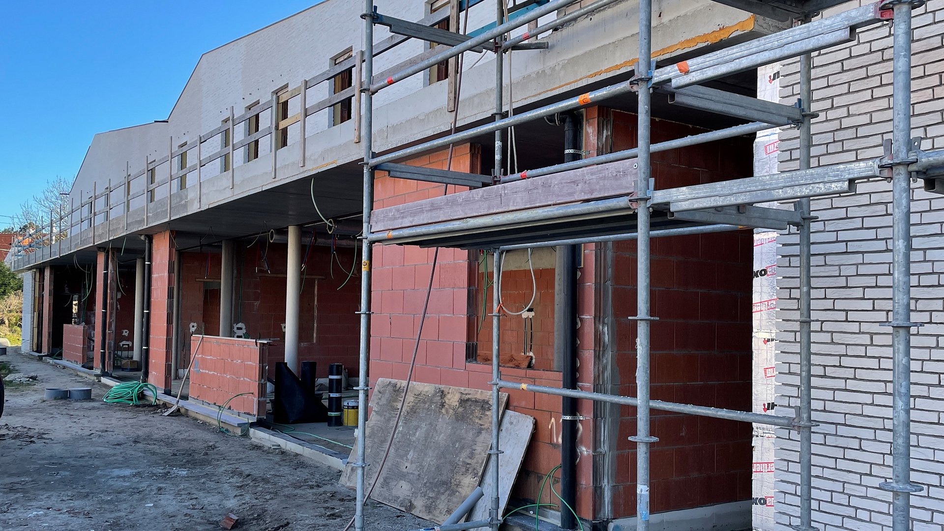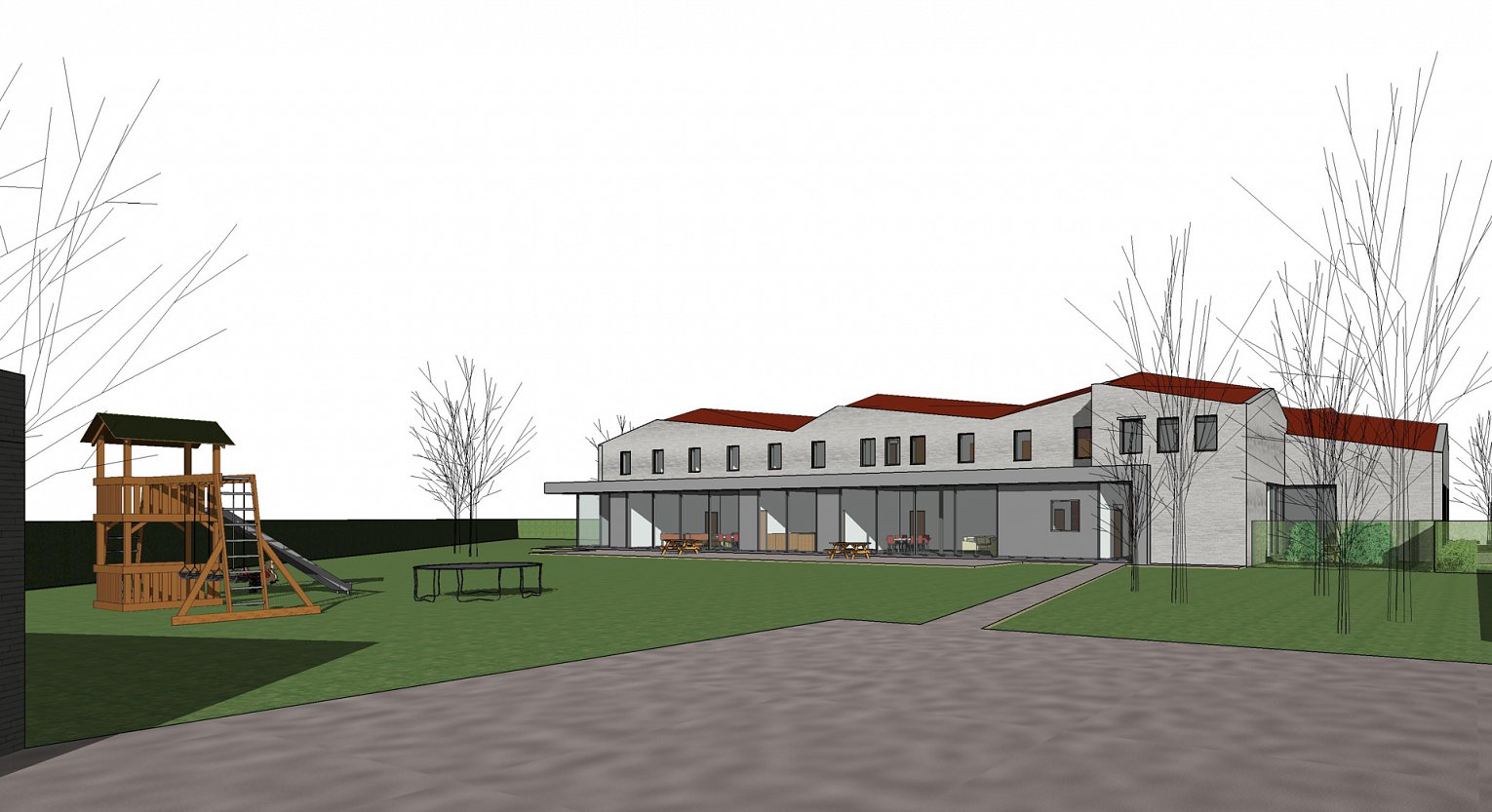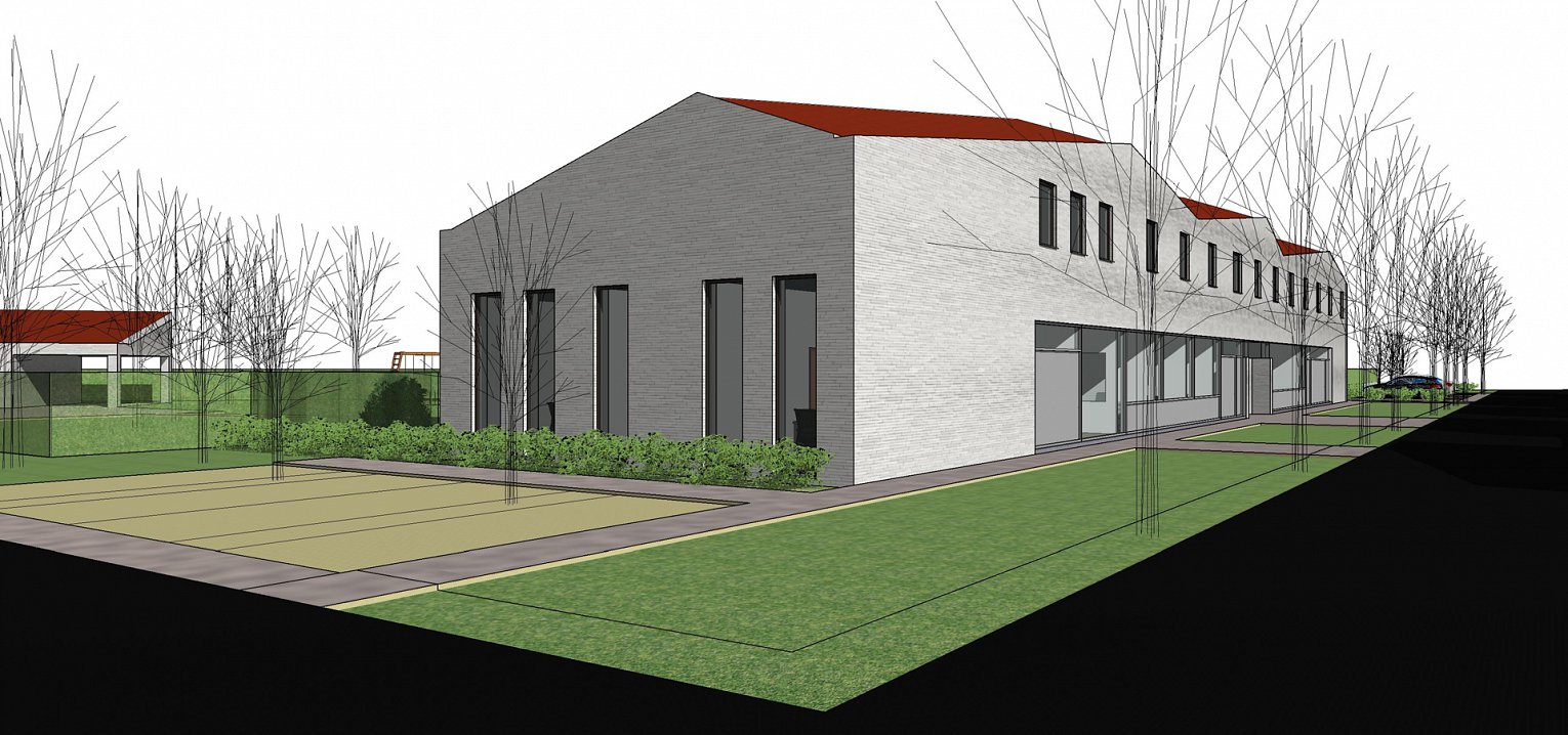 Het nieuwe gebouw sluit qua materiaalgebruik – witte parementsteen en rode dakpannen – aan met de omliggende bebouwing.