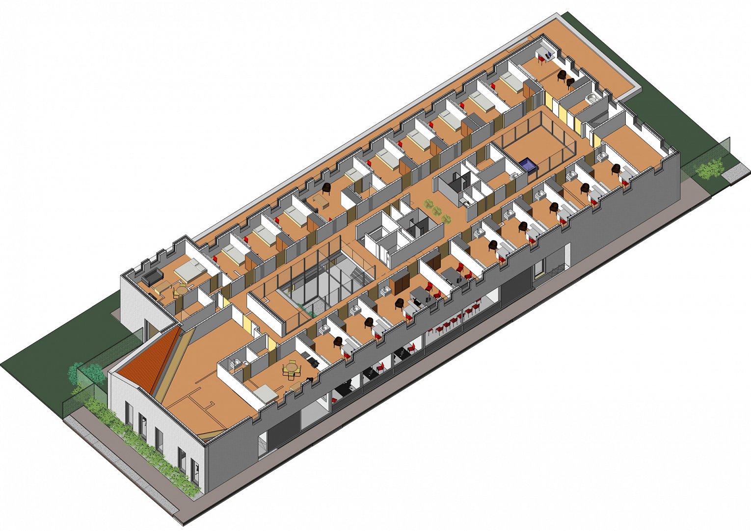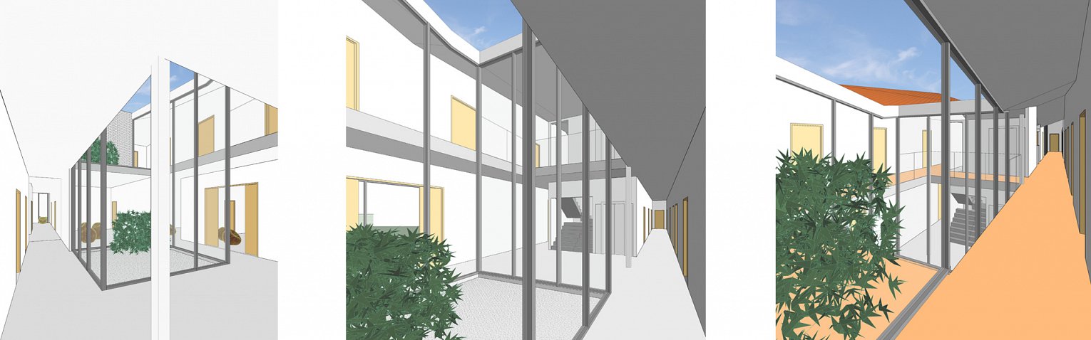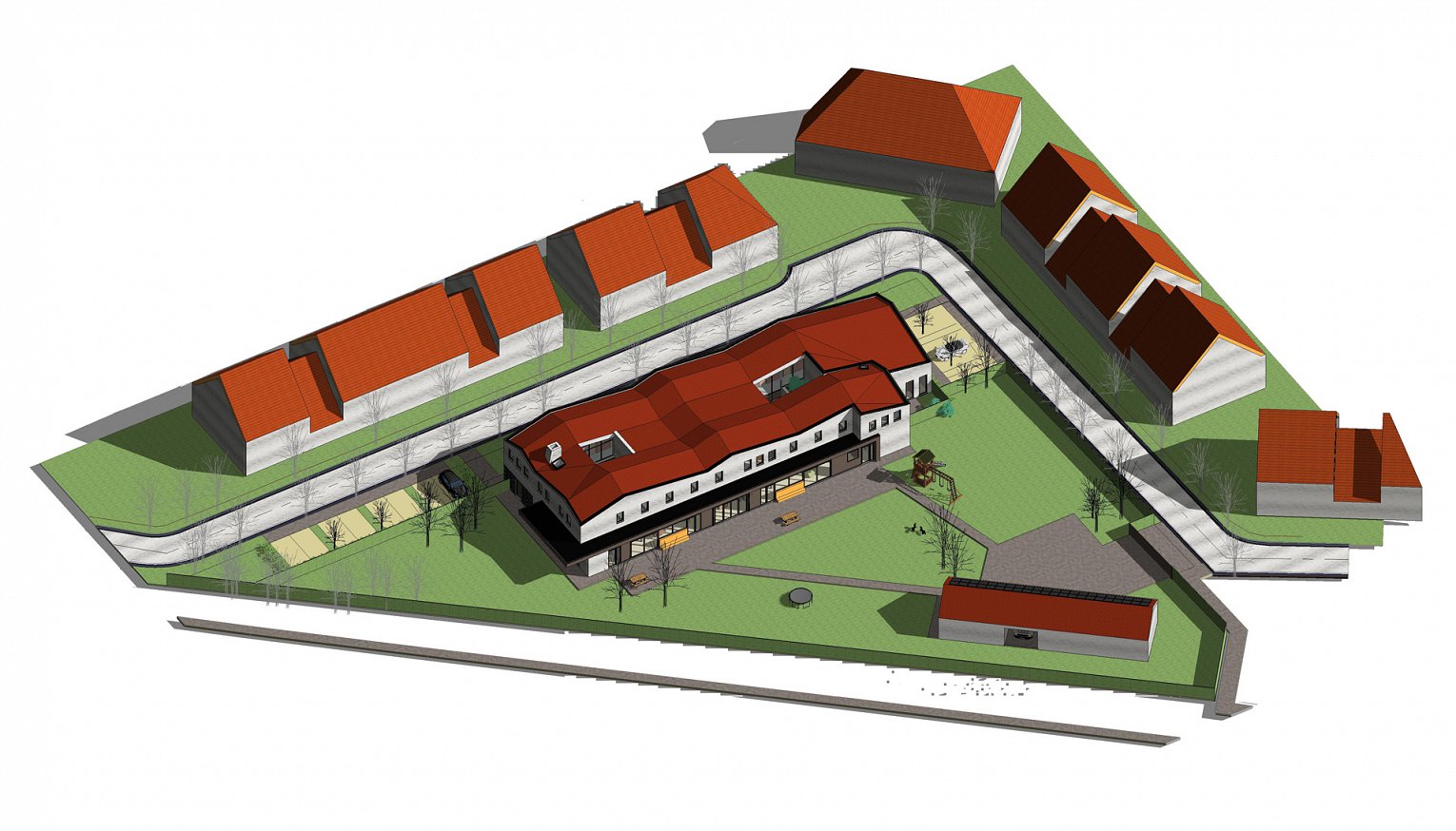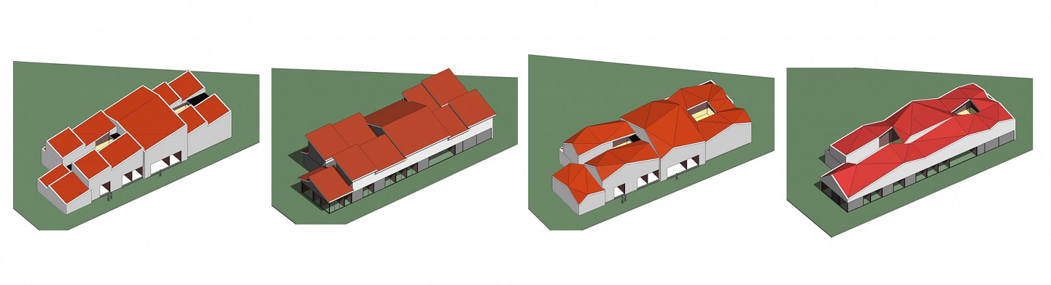 Het bouwvolume wordt opgevat als maximaal twee bouwlagen met een licht glooiende aaneensluiting van hellende daken waardoor het geheel de indruk geeft ‘onder een dekentje te rusten’.