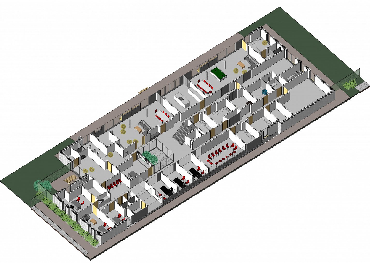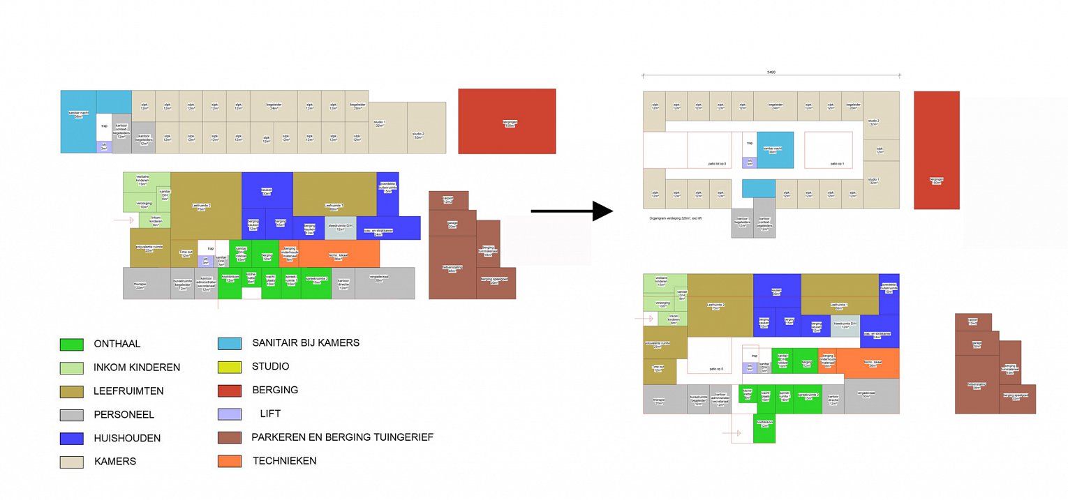 De kinderen worden onder dit dekentje opgevangen in een leuk groot huis, waar personeel en kinderen één grote familie vormen. De functies zijn zo ingeplant dat deze in elkaar vervloeien of net heel strak van elkaar zijn afgescheiden.