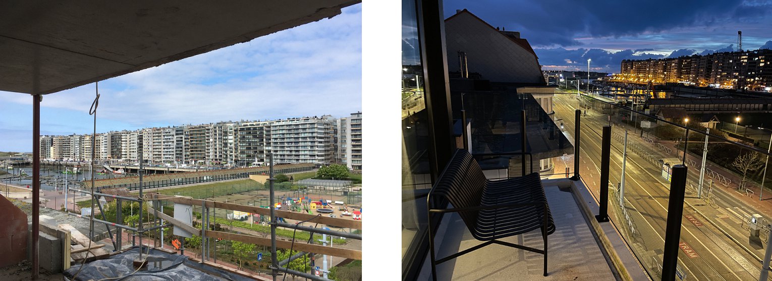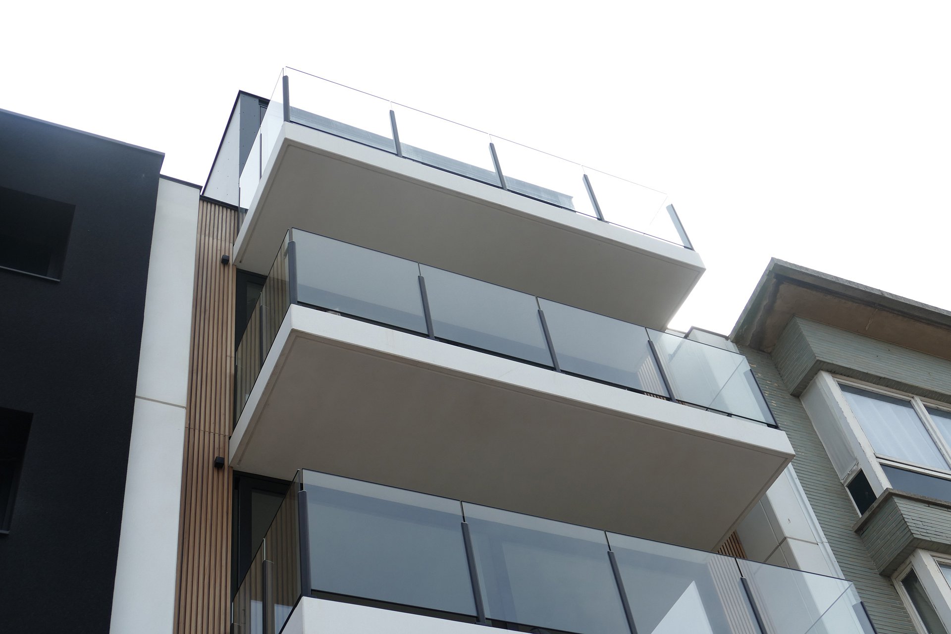 Voor de achtergevel werd er gekozen voor een lichtgrijze parementsteen en grijze betonnen balkons voorzien van zwarte aluminium balustrades.