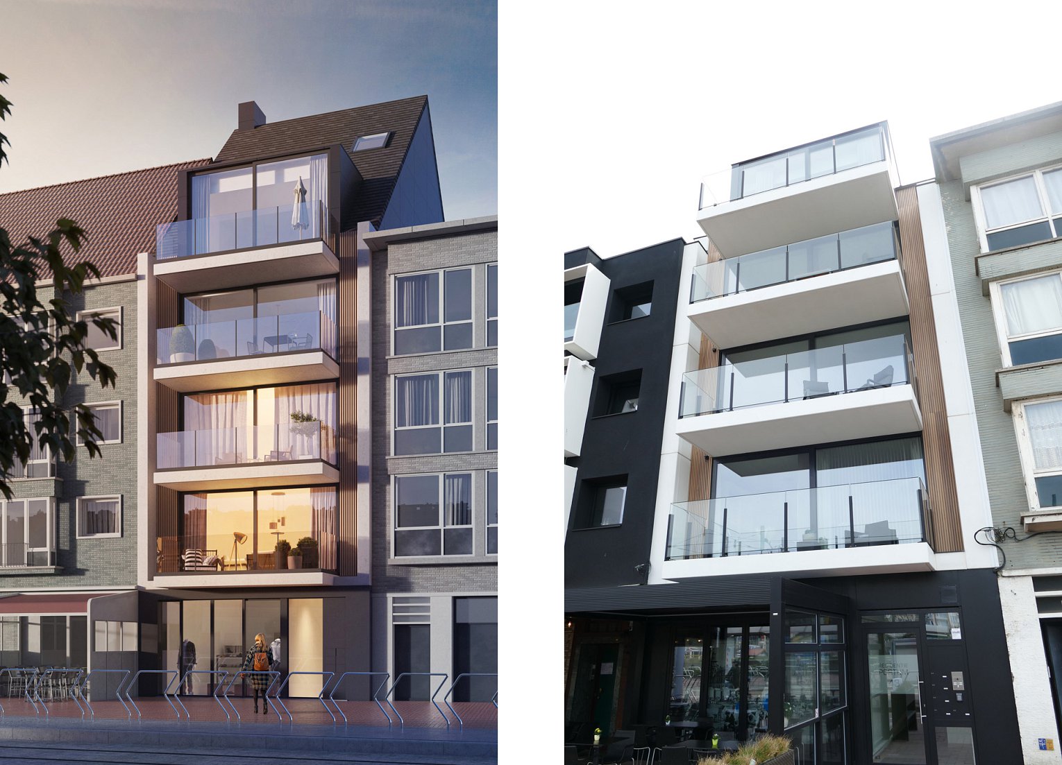Er werd gestreefd naar een kwalitatief gebouw met riante leefterrassen. De voorgevel krijgt een strakke ritmische indeling dat bepaald wordt een raster uit wit architectonisch beton en wordt verticaal geaccentueerd d.m.v. teruggetrokken verticale aluminium latten.