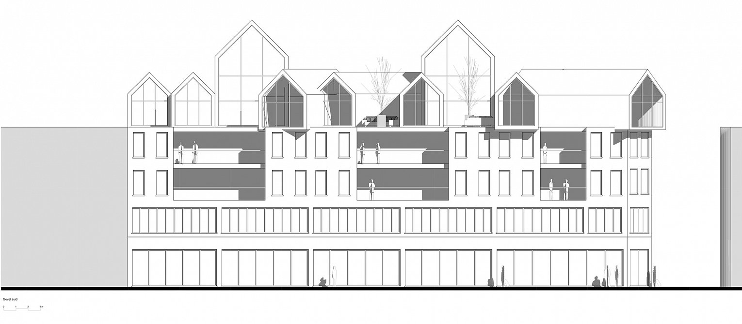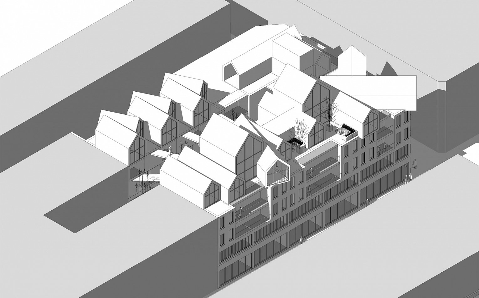Het project is opgevat als een verticale stad. Parkeren op niveau -1, winkelen op de gelijkvloerse verdieping. Kunstenaarsateliers op de eerste verdieping. Deze ateliers hebben grote ramen op de Visserstraat en brengen creativiteit tot dicht bij de passanten. Op 2e en 3e verdieping worden residentiële appartementen voorzien met grote woonterrassen. Het gebouw wordt bekroond met dakvilla’s die elk hun eigen tuin en terras hebben. Villa’s in het centrum van de stad. Villa’s met zicht over de daken van Blankenberge.