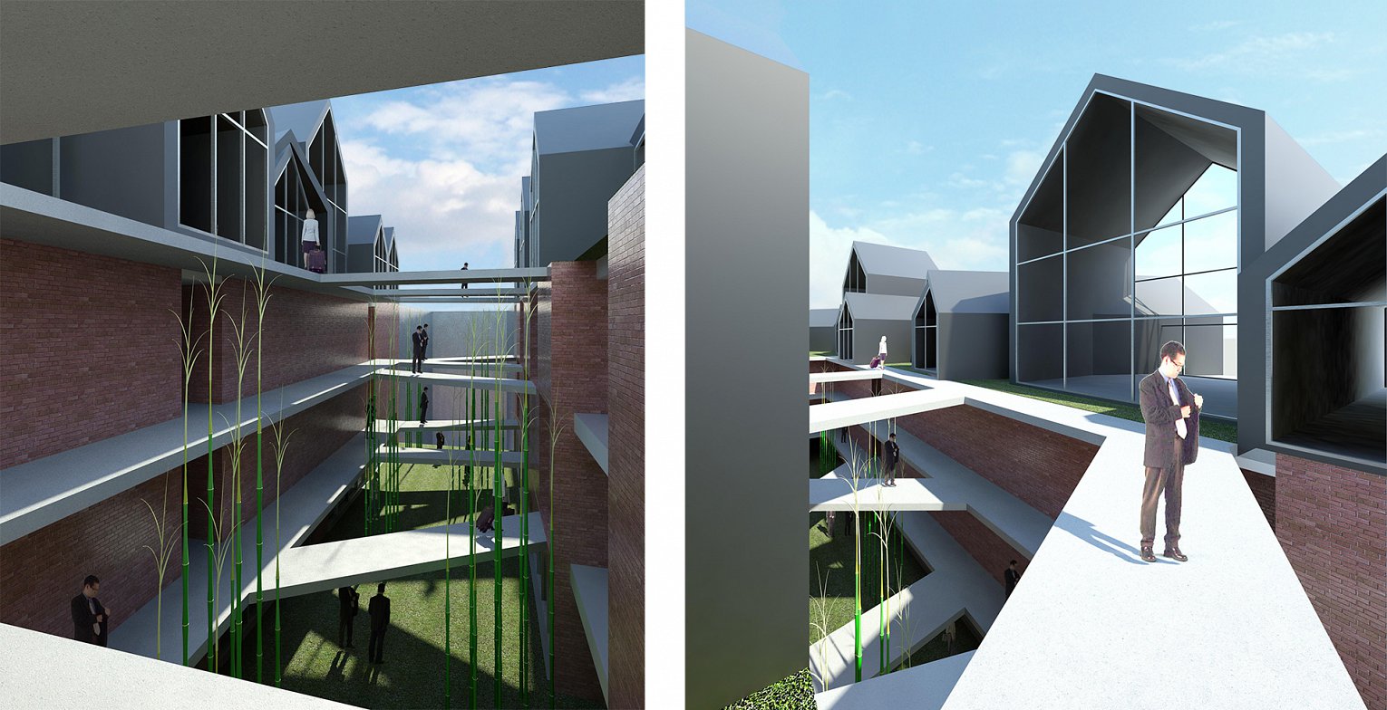 Het project organiseert zich rond een centrale verticale tuin. Loopbruggen slingeren tussen het overdadige groen en geven toegang tot de verschillende woongelegenheden.