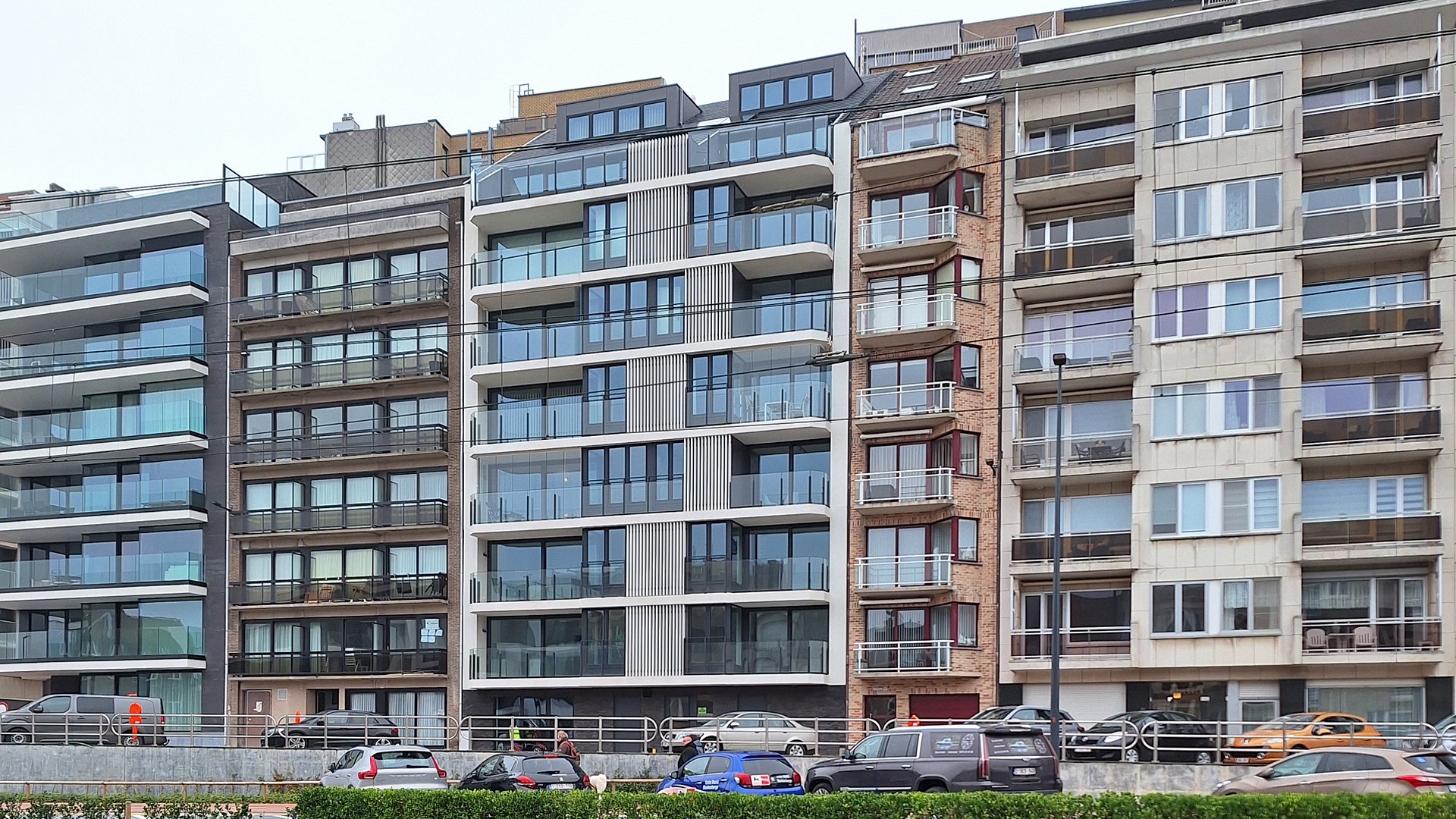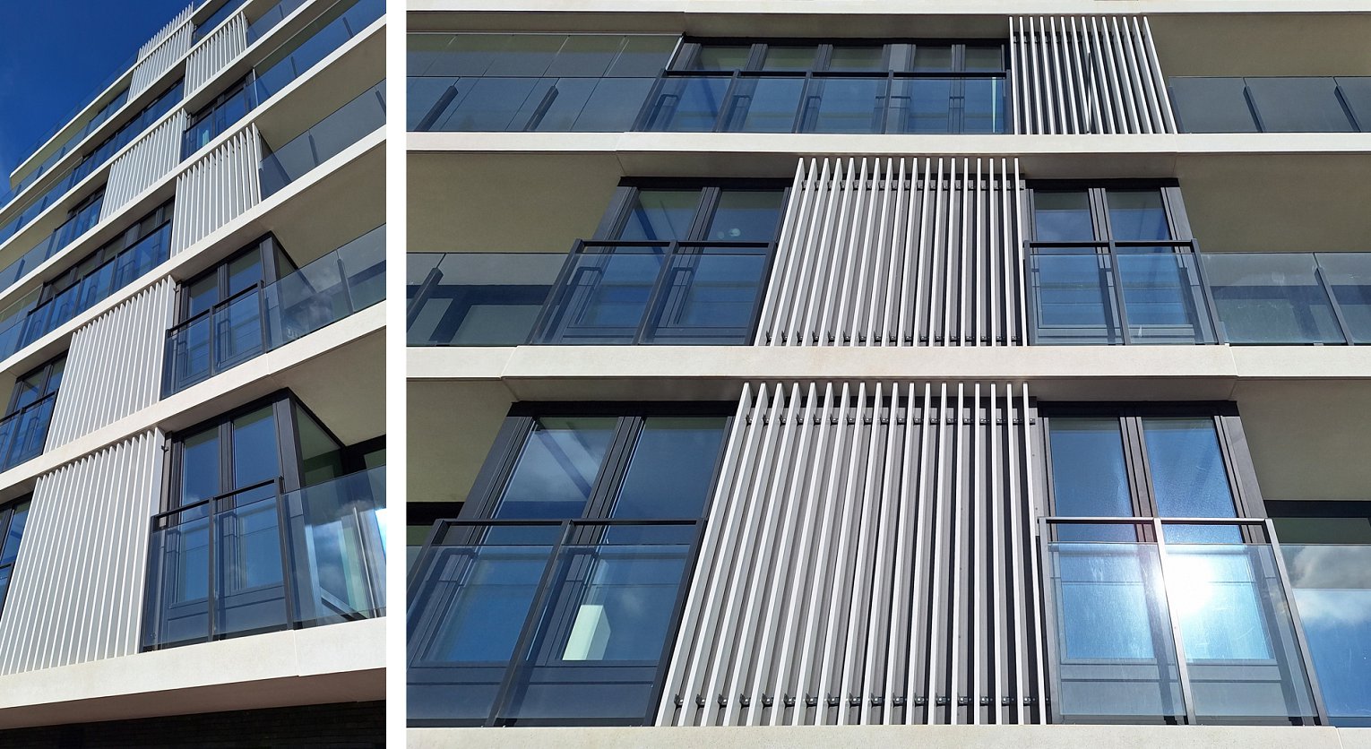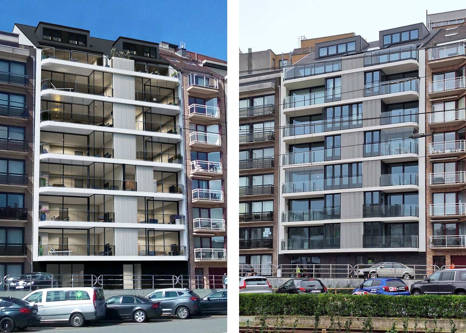 De gevel is voornamelijk opgebouwd uit glazen geveldelen – grote glaspartijen, glazen balustrades en wintertuinen in glas – waardoor het geheel luchtig en evenwichtig overkomt in het straatbeeld. De leefterrassen zijn variërend in breedte van 3.30m tot 4.65m en zijn 1.75m diep. Een verticaal accent in doorlopende aluminium lamellen breekt de horizontaliteit van de gevel.