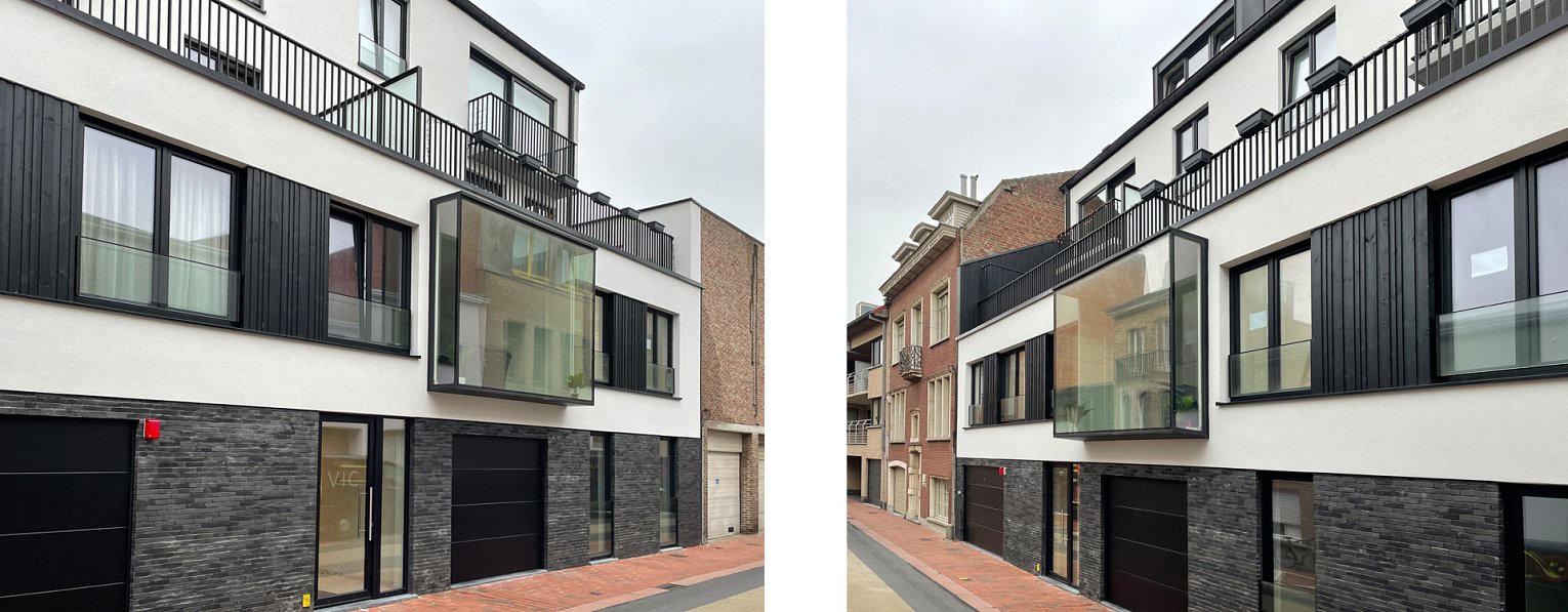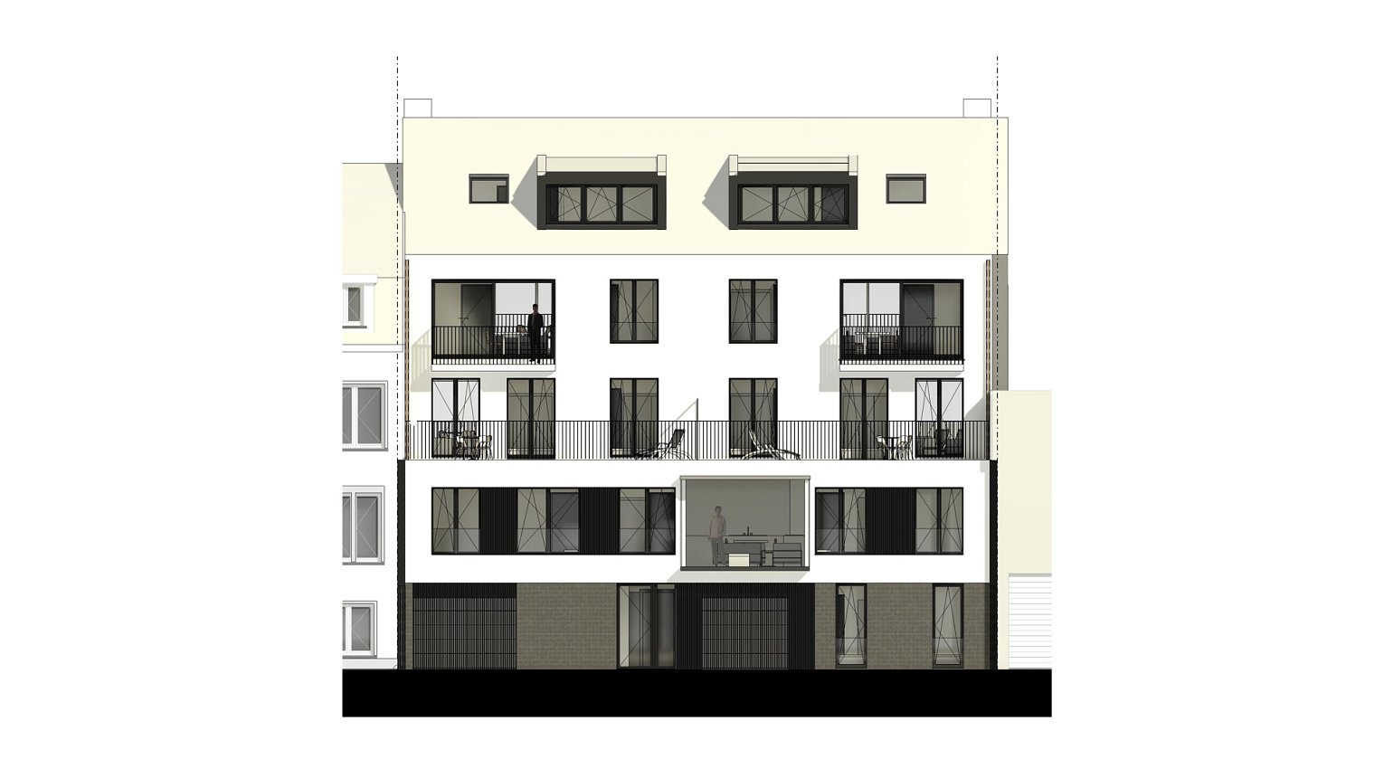 Er werd gestreefd naar een kwalitatief gebouw met riante leefterrassen. De voorgevel krijgt een strakke vorm waarbij het gelijkvloers bestaat uit donkergrijze parementsteen.