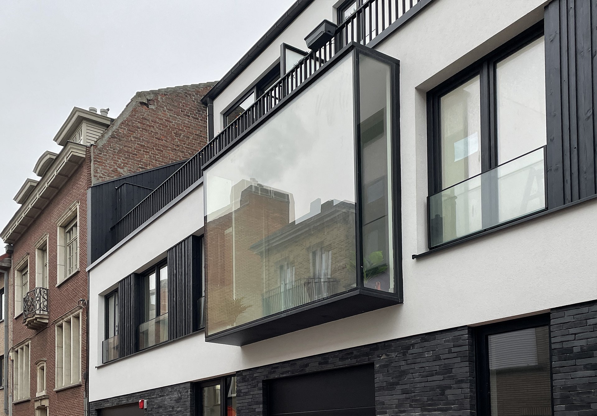 De overige verdiepingen worden in witte crepi afgewerkt. De ramen op de eerste verdieping zorgen, in combinatie met zwarte houten latten, voor een ritmische indeling met als accent een overdadig beglaasde erker. Door de bovenste 2 bouwlagen 3m naar achter te verschuiven, worden er kwalitatieve leefterrassen gecreëerd in combinatie met groenaanleg.