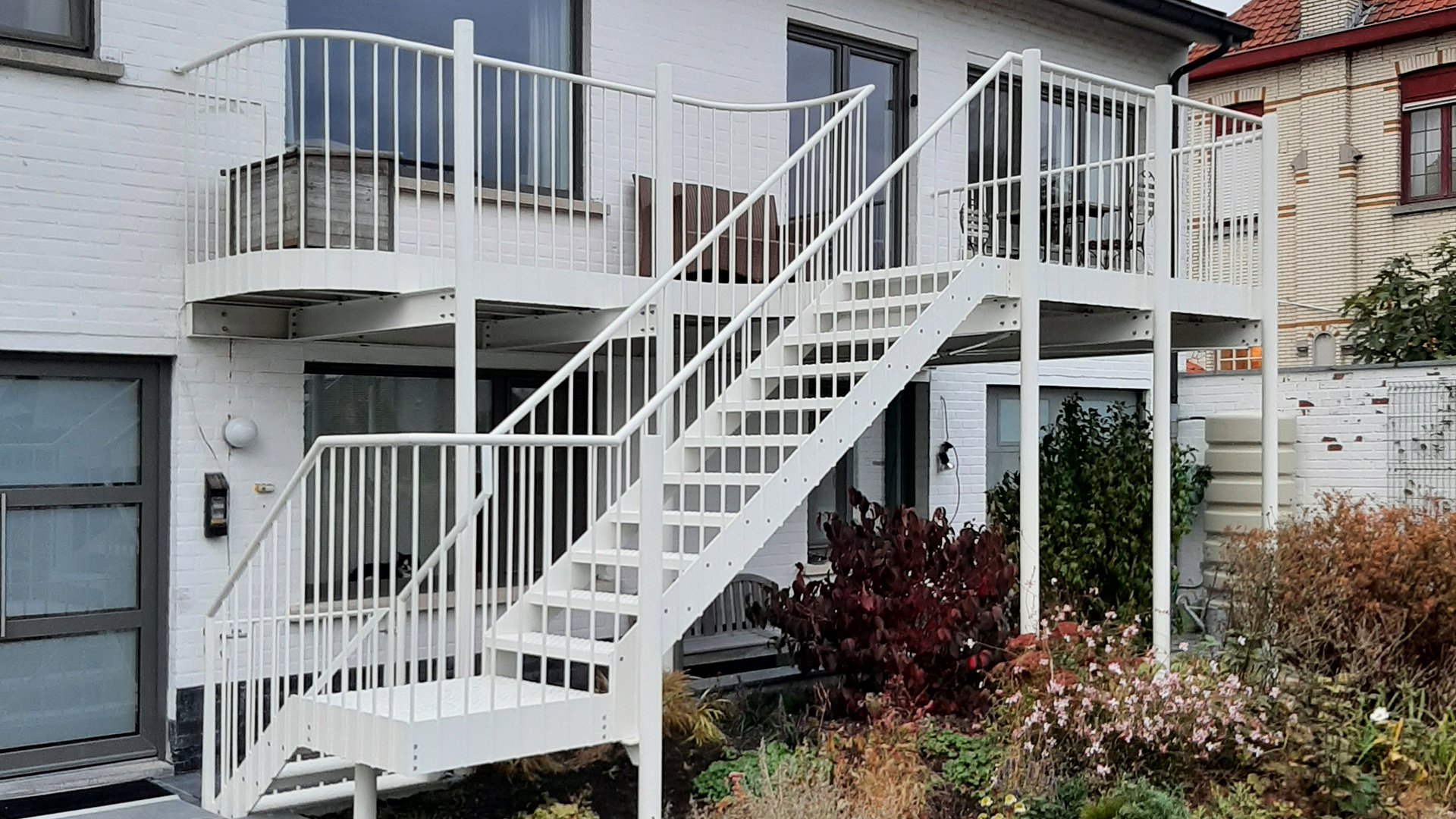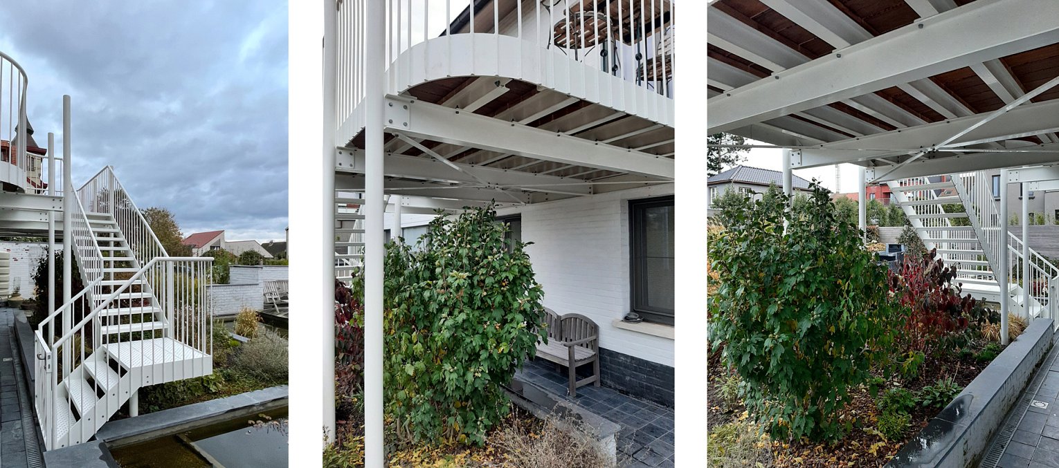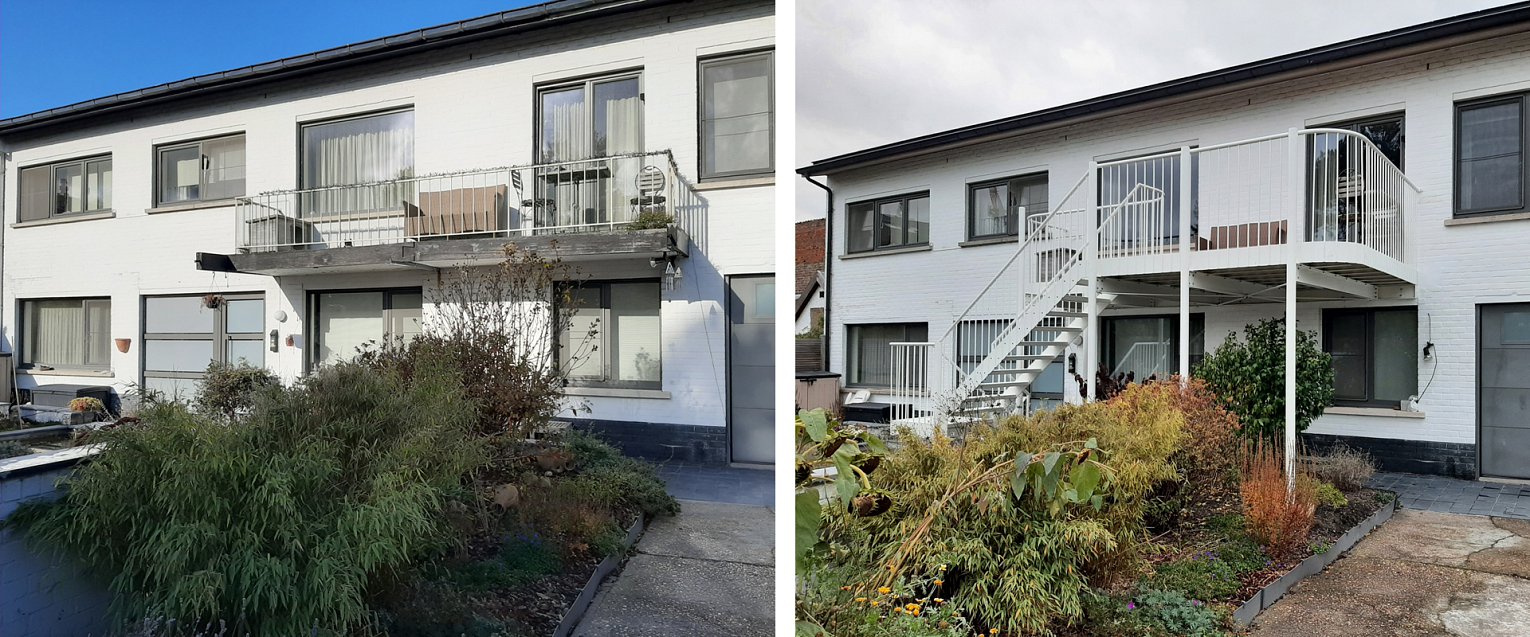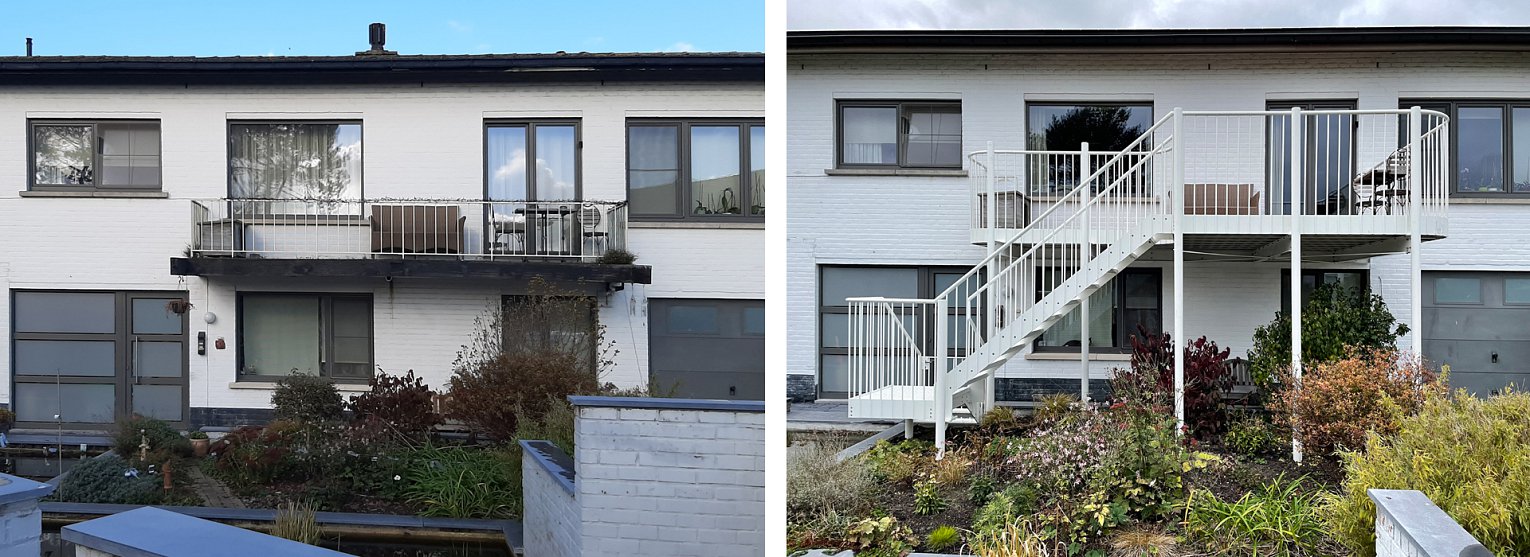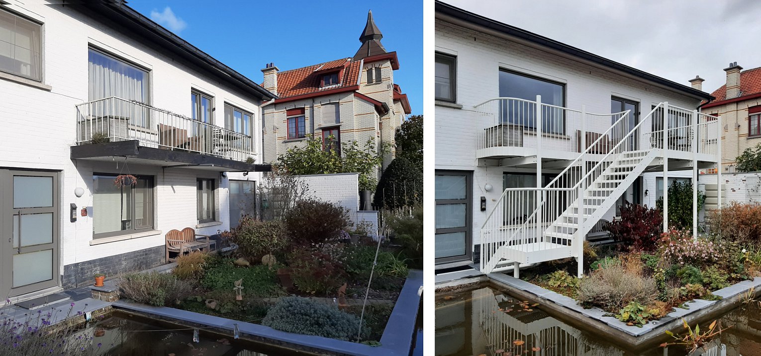 Het bestaande smalle terras is in zeer slechte staat en wordt afgebroken. Er wordt een groter nieuw groter terras voorzien dat rechtstreeks toegang biedt tot de tuin dmv een trap. Terras en trap worden gerealiseerd in staal wit gelakt. Het terras is waterdoorlatend (houten planken met spatie tussen) zodat het onderliggende groen kan behouden blijven.