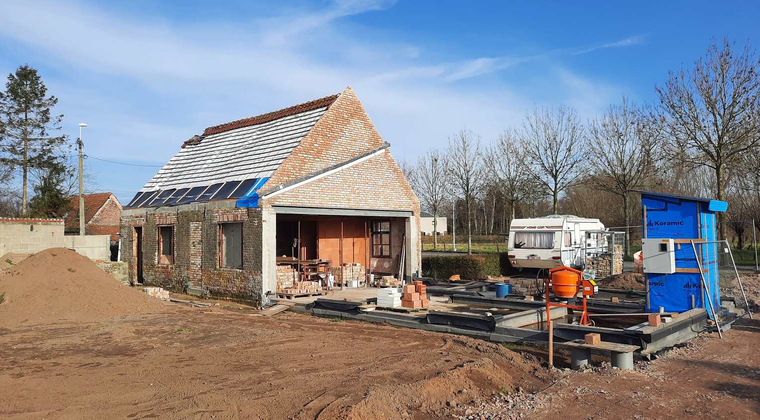 In de achtertuin wordt een nieuwe tuinberging opgetrokken die volledig in dezelfde lijn/stijl ligt als de nieuwe uitbreiding.