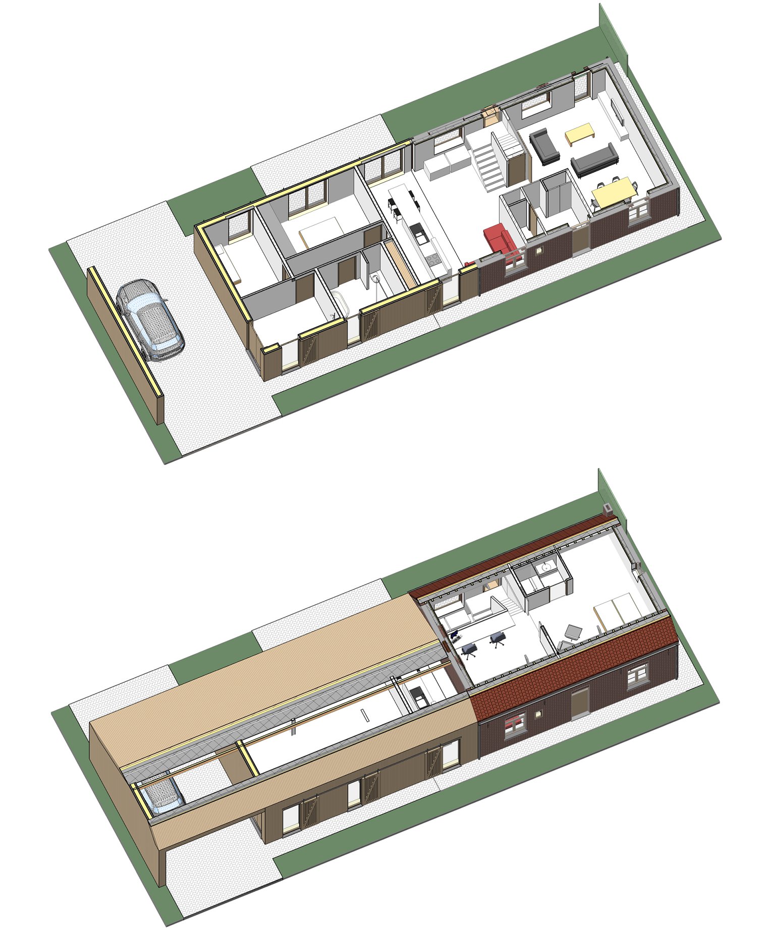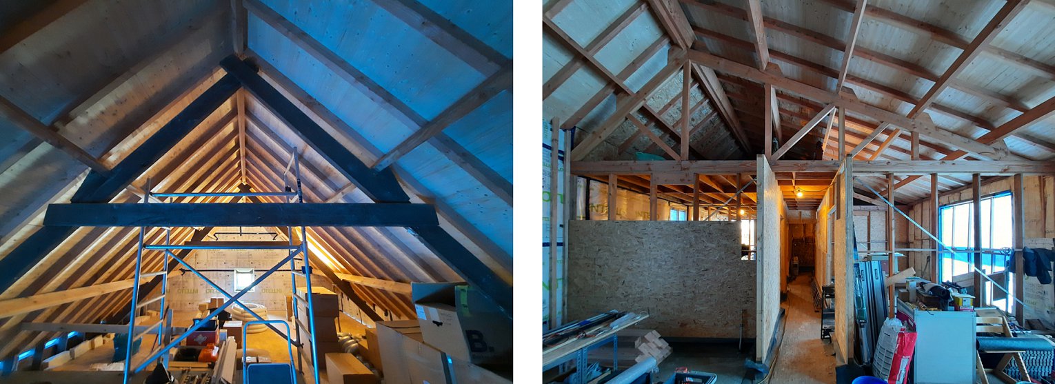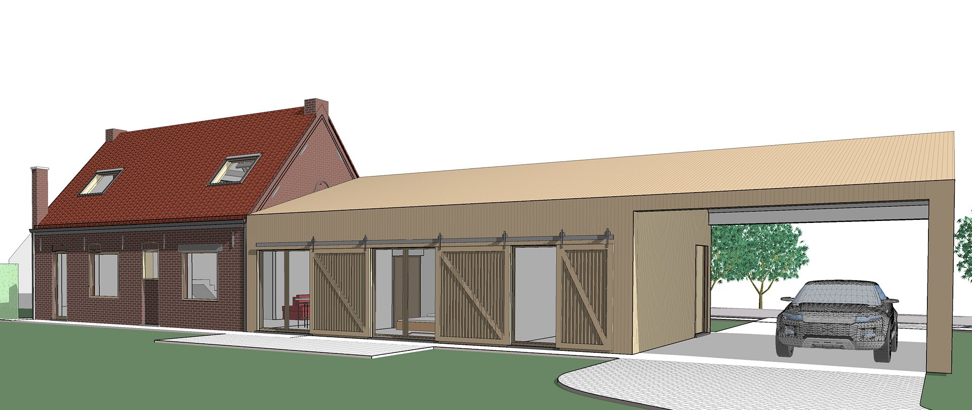 In het verlengde van de bestaande woning wordt een moderne en strakke uitbreiding voorzien, waarbij zowel gevels als dak worden afgewerkt in natuurlijk te vergrijzen houten lattenwerk. Als architectuurtaal wordt er hier een abstracte benadering gekozen van de typische houten schuren, zodat de verschijningsvorm mooi aansluit bij het bestaande gegeven. Binnenin zorgen de nodige vides en hoge ruimten voor een verrassende ruimtelijkheid met aandacht voor de zichtbaar blijvende sarkingdaken.