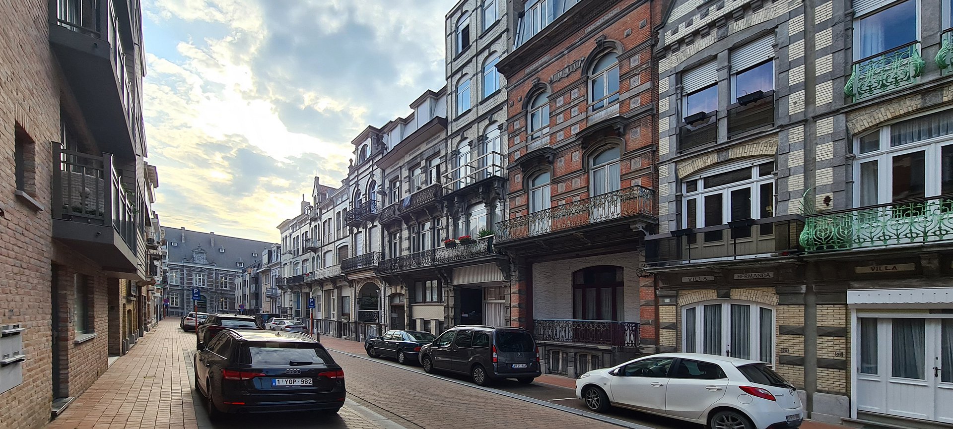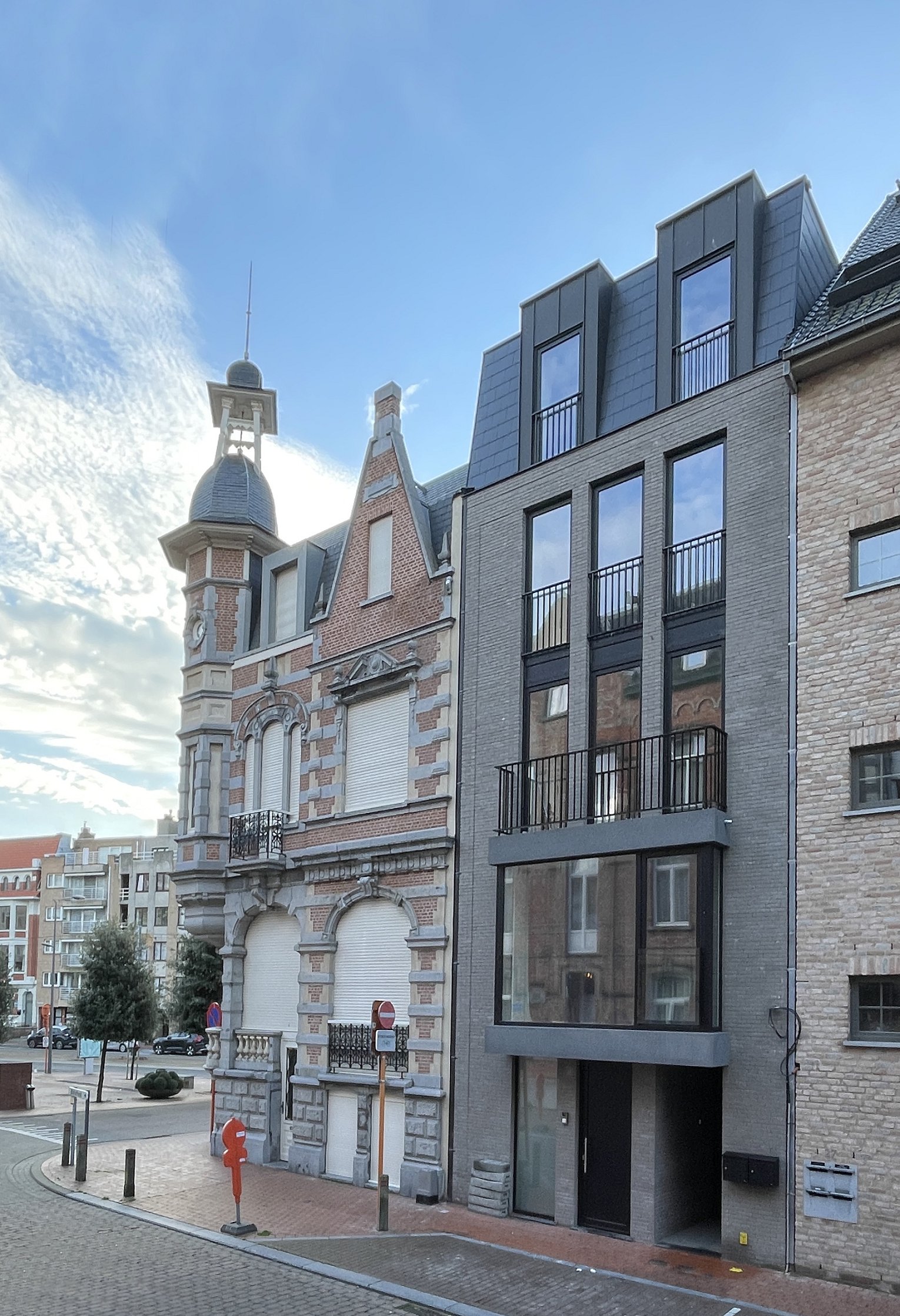 De gevel is opgebouwd in hetzelfde ritme als de belle époque gevels : verticale ramen, licht metselwerk, geprofileerd metselwerk en groot raam op eerste verdieping.