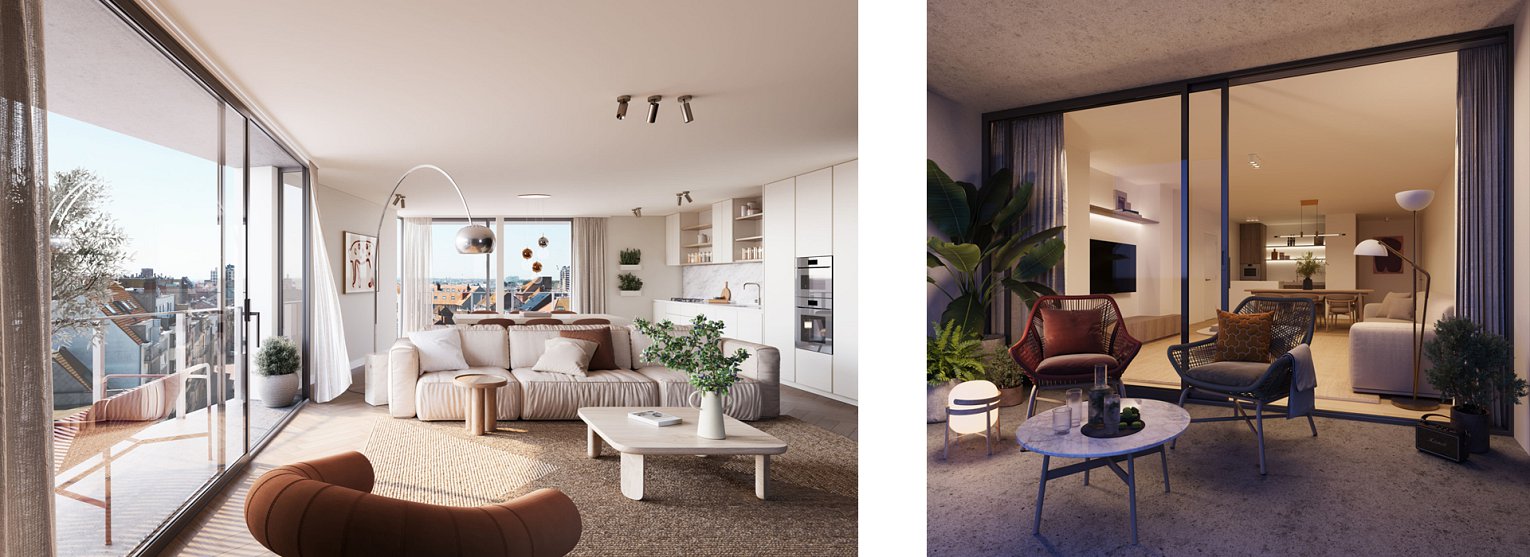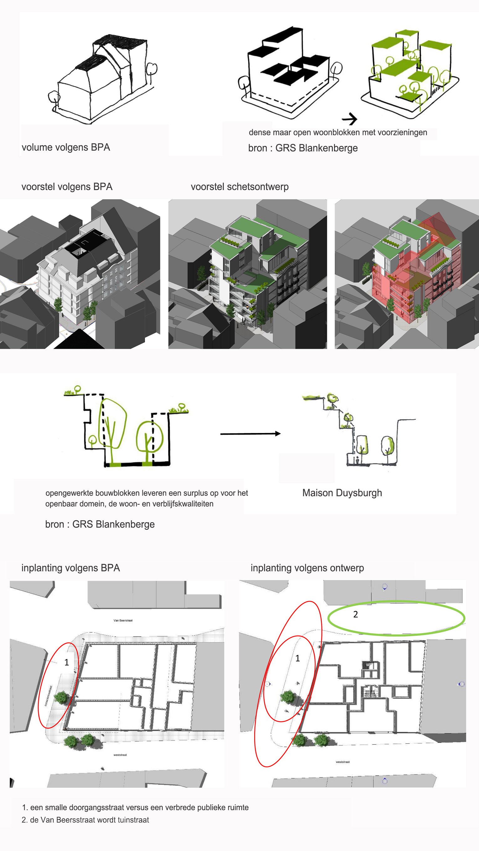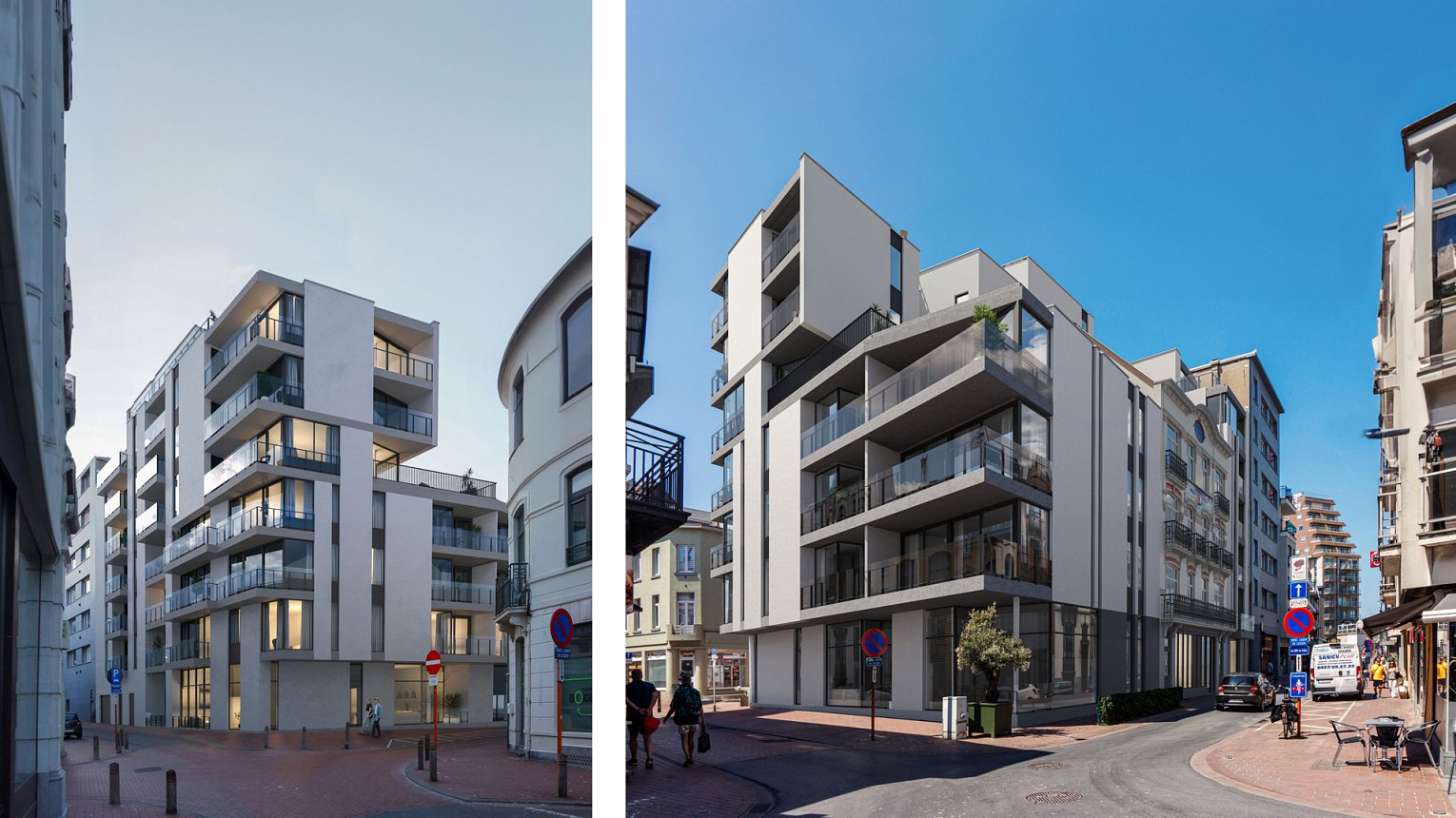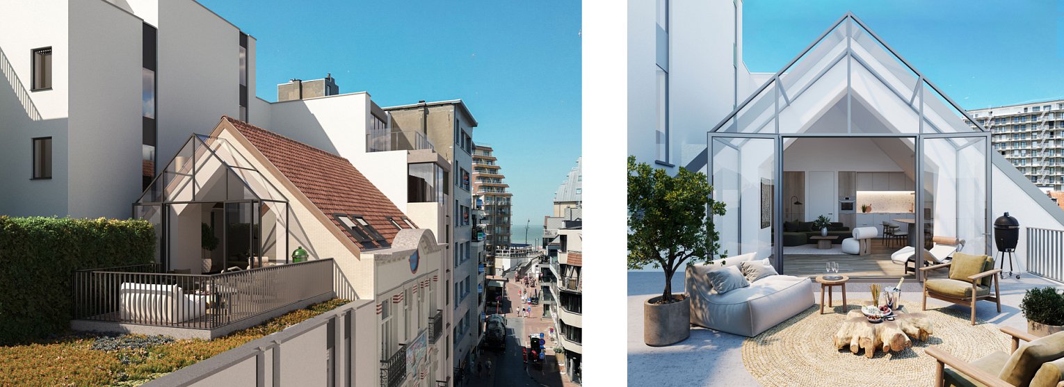 Door het toelaatbare gabarit doordacht te kneden, rekening houdende met de natuurlijke oriëntatie ontstaat er een unieke ruimtelijkheid. Verschuiving van bouwvolumes creëert aangename dakterrassen waar veelvuldig groen kan primeren.