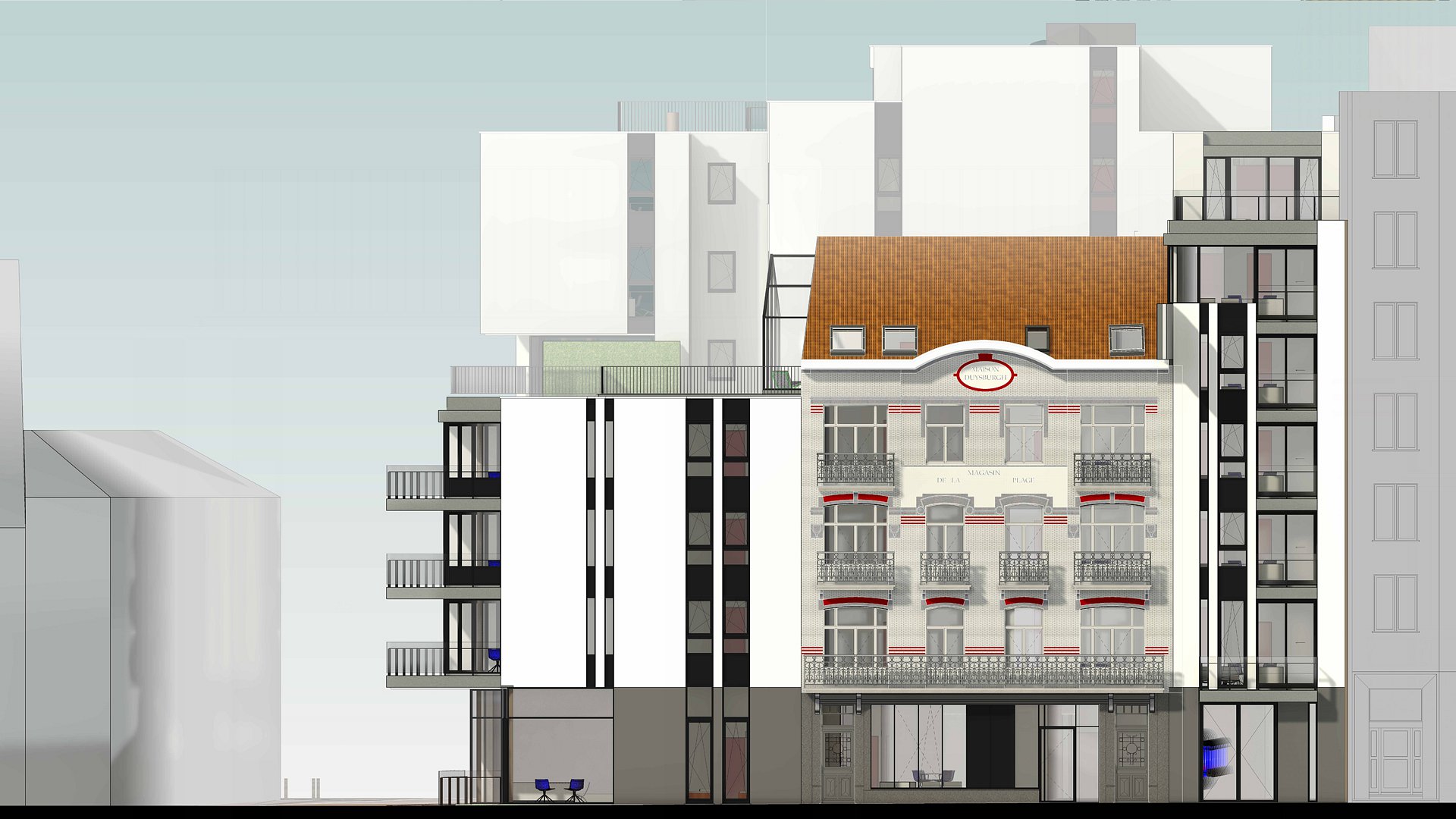 De strakke architecturale vormentaal van de nieuwbouw sluit zich naadloos aan bij de ingenieus geïntegreerde beschermde Belle Epoque gevel van Maison Duysburgh.