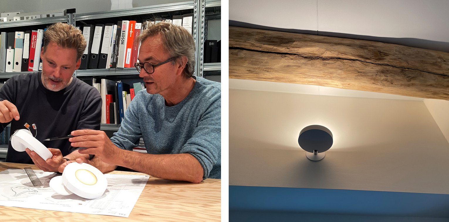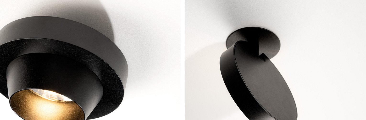 De korte rotule zorgt ervoor dat het armatuur omzeggens tegenaan het plafond of tegen de muur zweeft, maar toch in alle richtingen oriënteerbaar is. De ledschijf, de vastzettingsschijf en de lichtbundel vormen poëtisch overlappende cirkels. Licht en armatuur worden één. Clever.