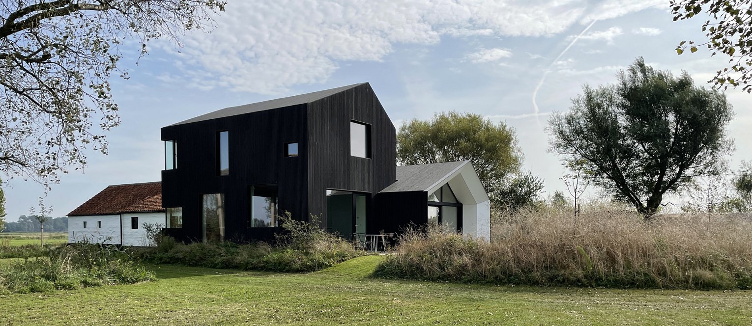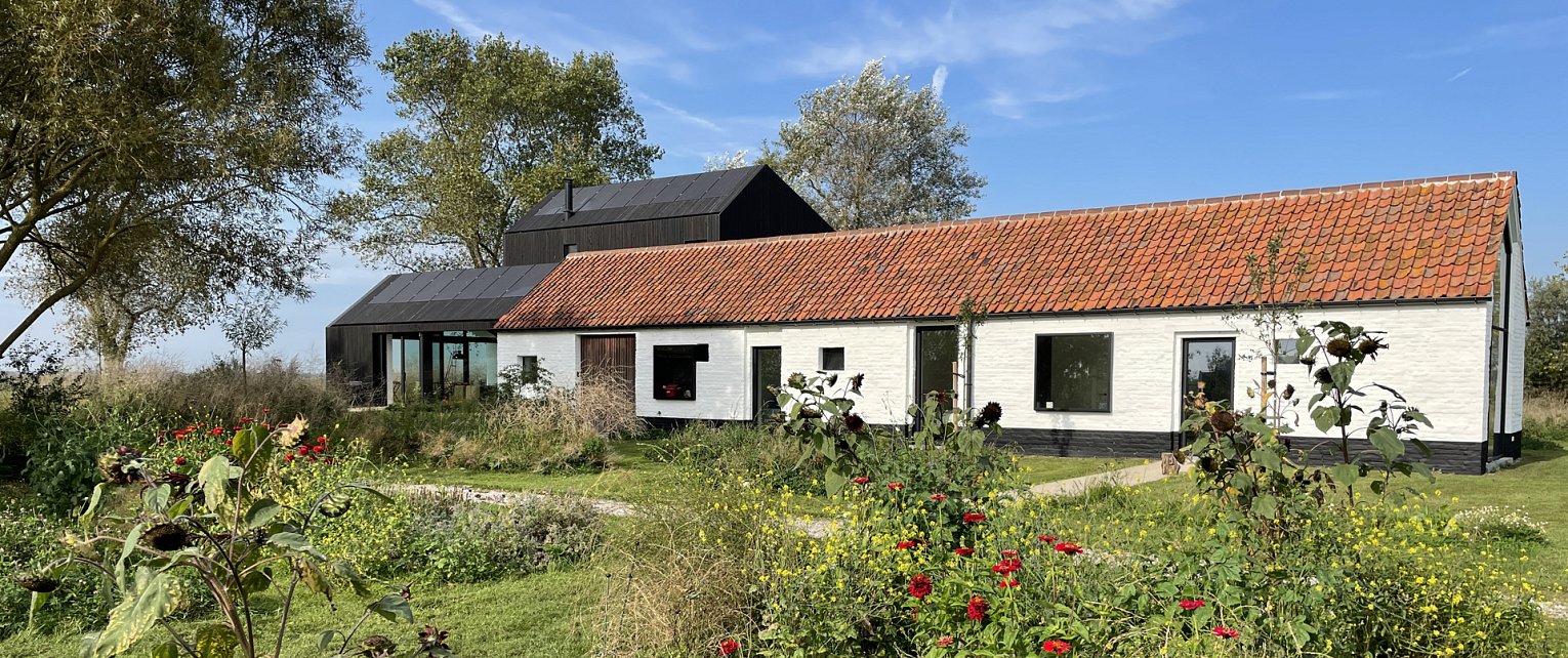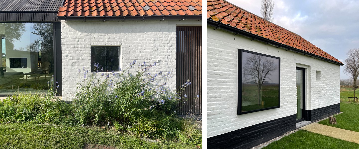 De woning is een combinatie van oud en nieuw. In de oude langshoeve werden slaapkamers voor de kinderen ondergebracht. De kop van het gebouw werd uitgevoerd als een hedendaagse aanvulling. Het zwarte houten latwerk zorgt ervoor dat het gebouw verdwijnt in de omgeving, en enkel de traditioneel wit geschilderde langshoeve met zijn typische rode dakpannen wordt waargenomen.