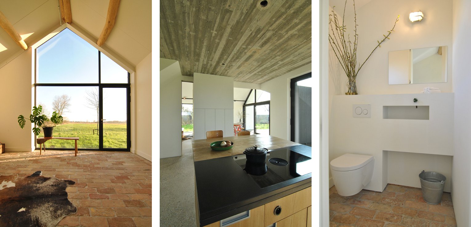 De materialen zijn tot een minimum beperkt en zijn in al hun eenvoud en brute kracht aanwezig. Witte gepleisterde muren wisselen af met zichtbare -ter plaatse gegoten- beton in plankenbekisting. De vloeren van het oude landbouwgebouw zijn uitgevoerd in baksteen plavuizen, de hedendaagse aanvulling met leefruimte en keuken in gepolijste beton. De trap, badkamer en slaapkamer op de verdieping zijn gerealiseerd in geoliede multiplexbeplating.