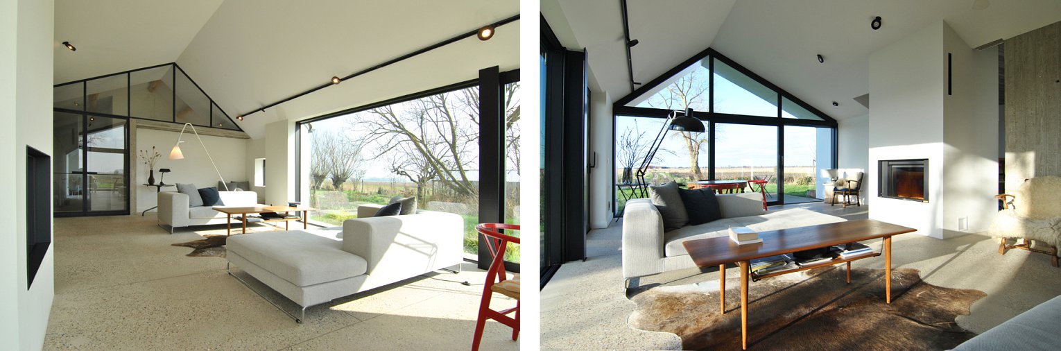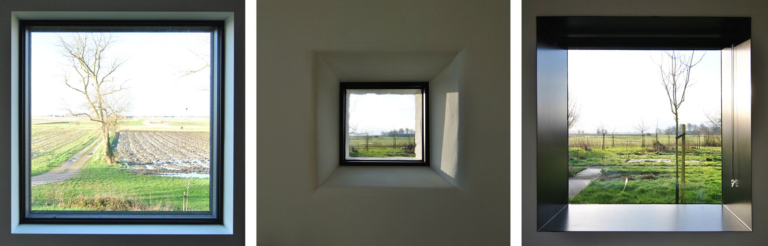 Binnen en buiten vervloeien in elkaar. De ramen zijn zuivere uitsnijdingen in de gevels. De zichten zijn gekaderde landschappen. De witte binnenmuren en plafonds worden doorgetrokken in de luifel waardoor de luifel als krachtig wit element het gebouw markeert en bezoekers verwelkomt vanaf de lange rechte oprit.