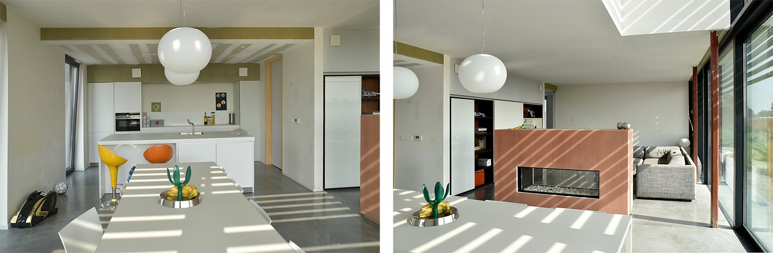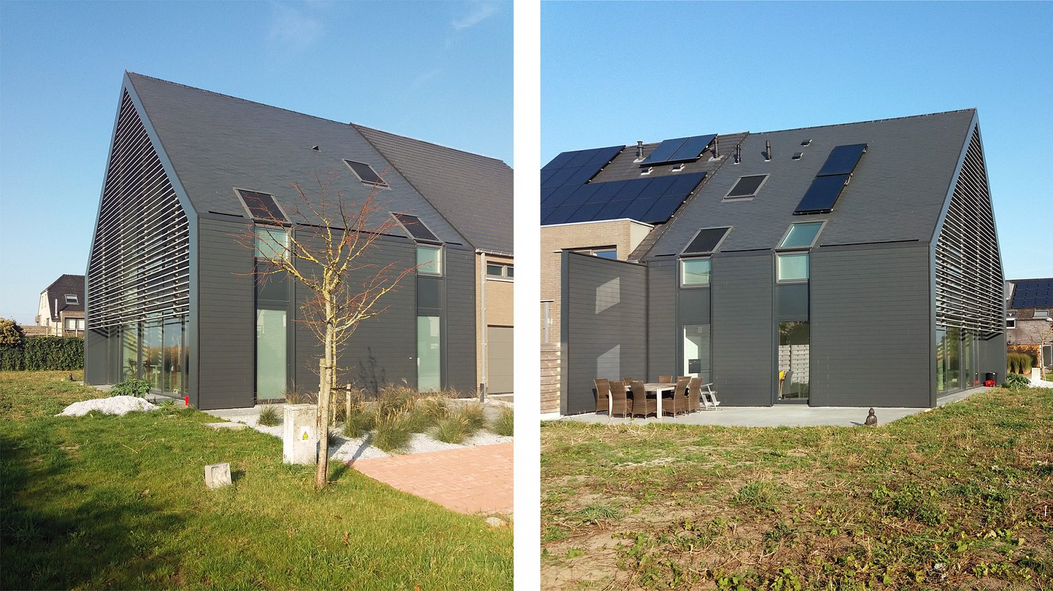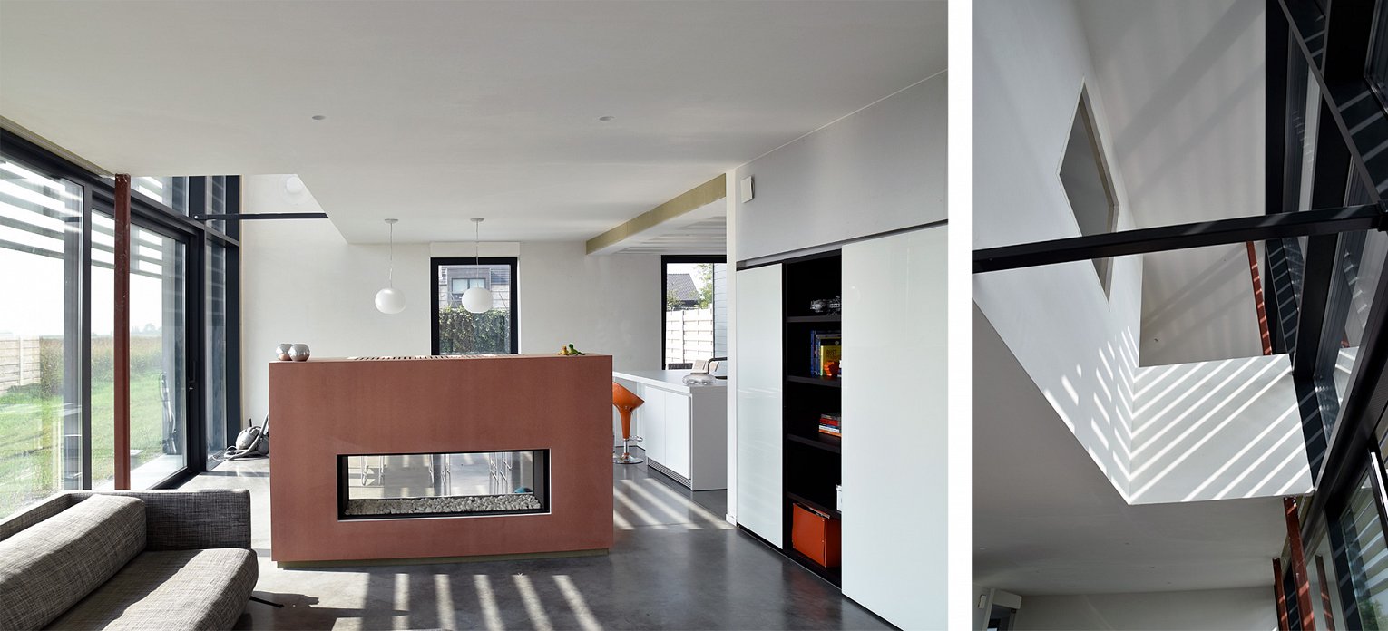 Het perceel bevindt zich op het einde van een doodlopende straat met 180 graden uitzicht op de Uitkerkse Polders. Het was de bedoeling om een zo compact mogelijk volume te realiseren. De voor- en achtergevel worden vrij gesloten gehouden. De zuidgerichte zijgevel met zicht op het mooie polderlandschap wordt zoveel mogelijk opengewerkt door middel van een gordijngevel die voorzien is van lamellen.