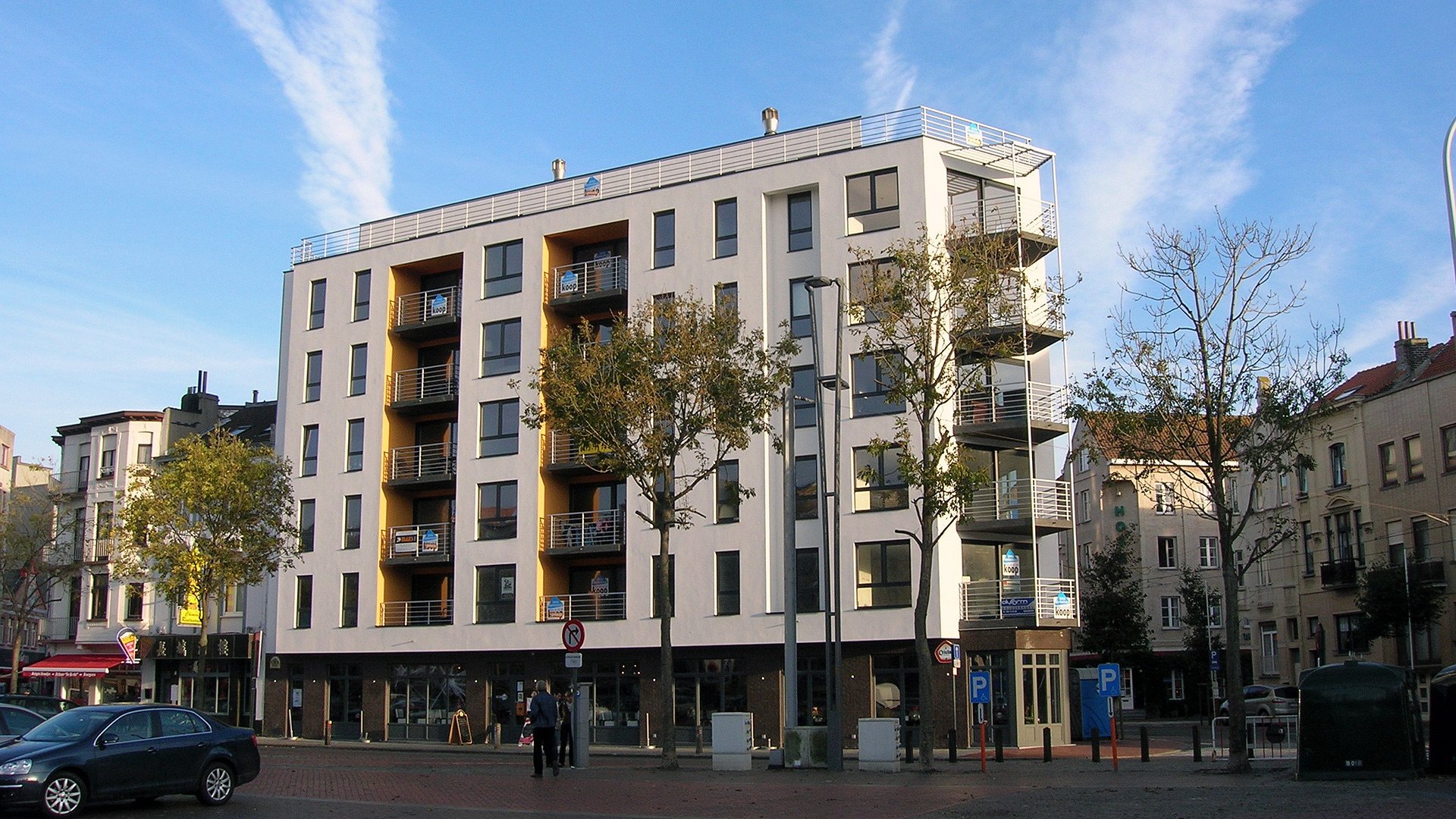 Appartementencomplex met 21 appartementen en handelsruimte. Er werd geopteerd het gebouw een statig uitzicht te verlenen met wit gepleisterde gevels en verticale ramen. De balkons werden gerealiseerd als buitenkamers uitgesneden uit het volume. Het geheel wordt bekroond met een dakappartement met groot zonneterras.