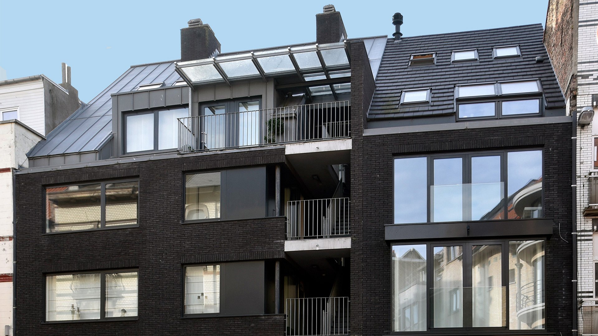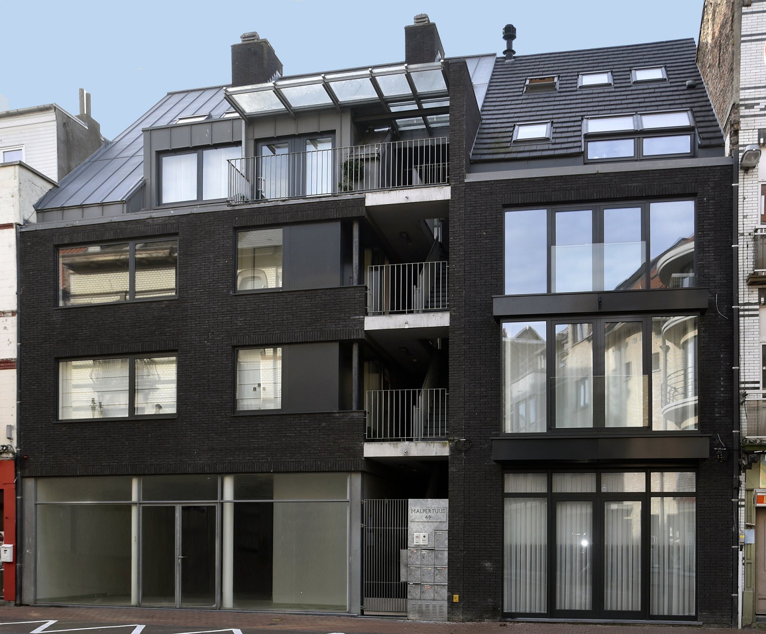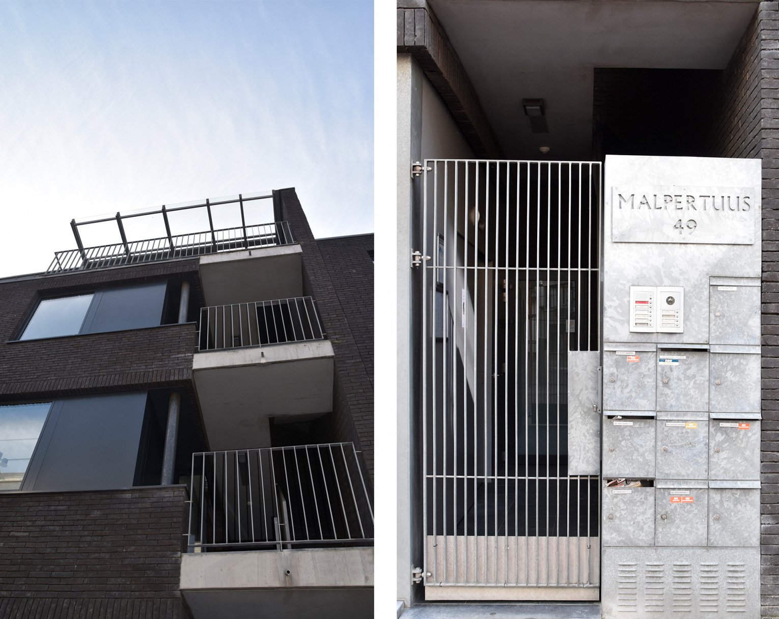 Het sobere materiaalgebruik wordt consequent aangewend. Gegalvaniseerde stalen elementen worden gebruikt als balustrades, brievenbussen, raampartijen, luifels enz... In combinatie met het zwarte metselwerk is het gebouw een rustpunt in het gefragmenteerde straatbeeld.