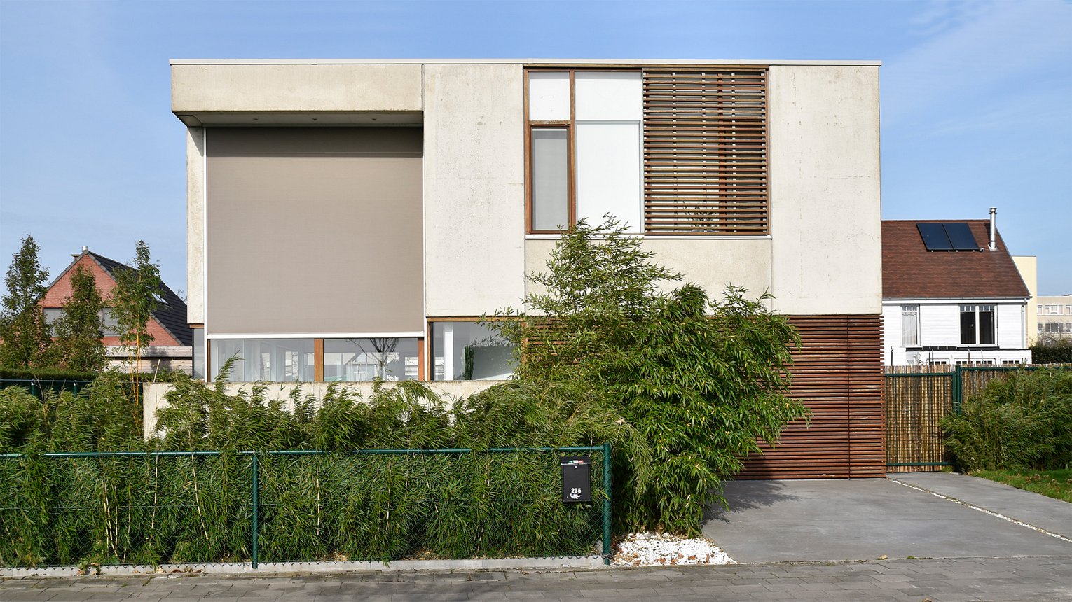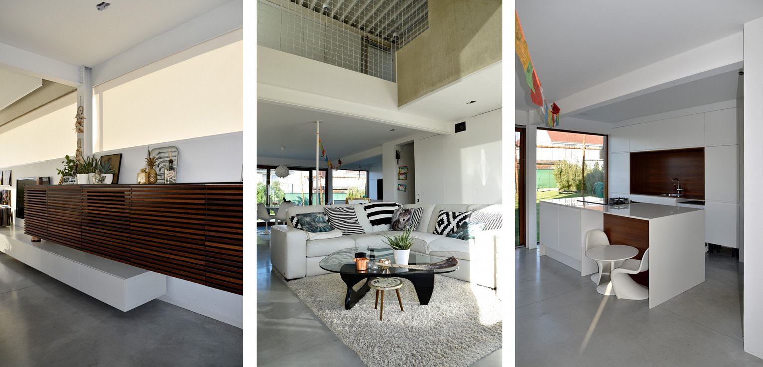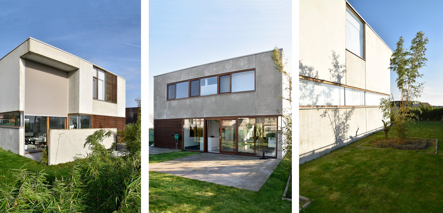 Het contrast van de ruwe industriële betonnen elementen gecombineerd met het houten buitenschrijnwerk zorgt voor een verrassende architectuur.