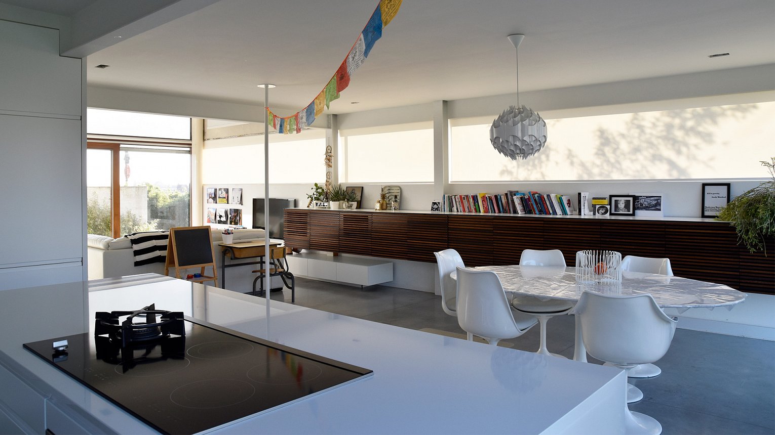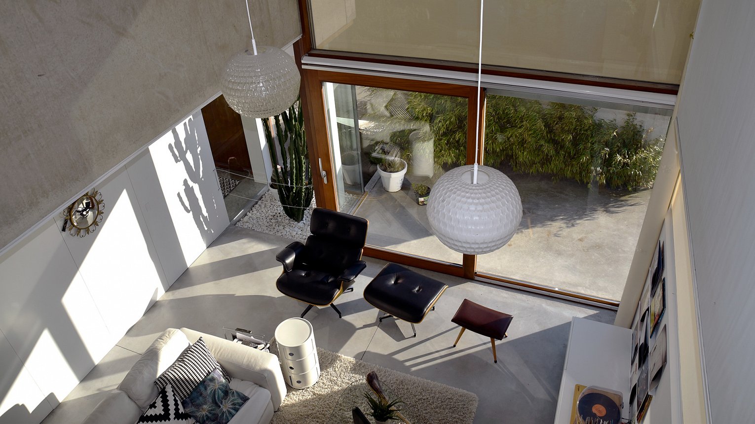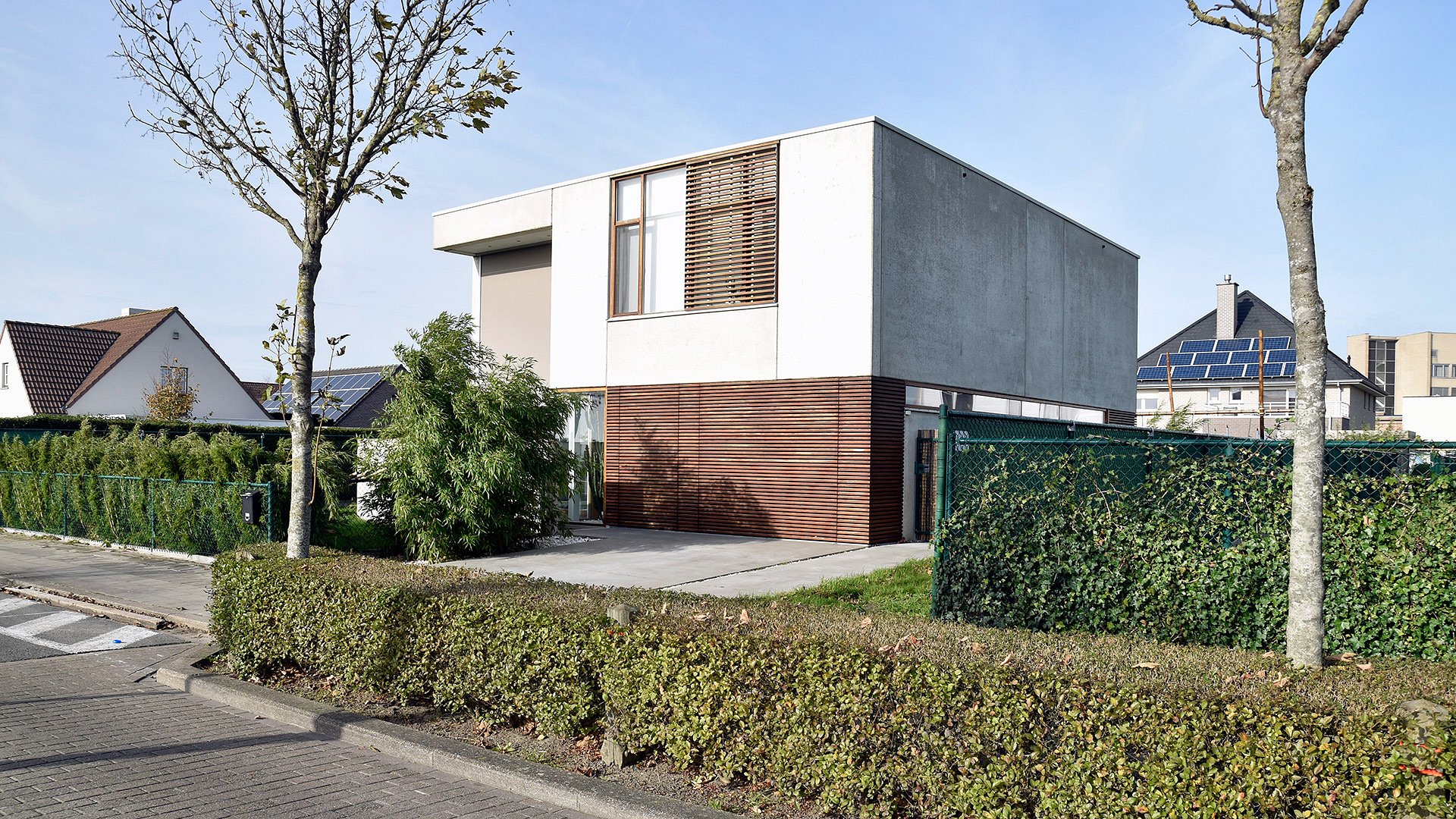 Het contrast van de ruwe industriële betonnen elementen gecombineerd met het houten buitenschrijnwerk zorgt voor een verrassende architectuur.