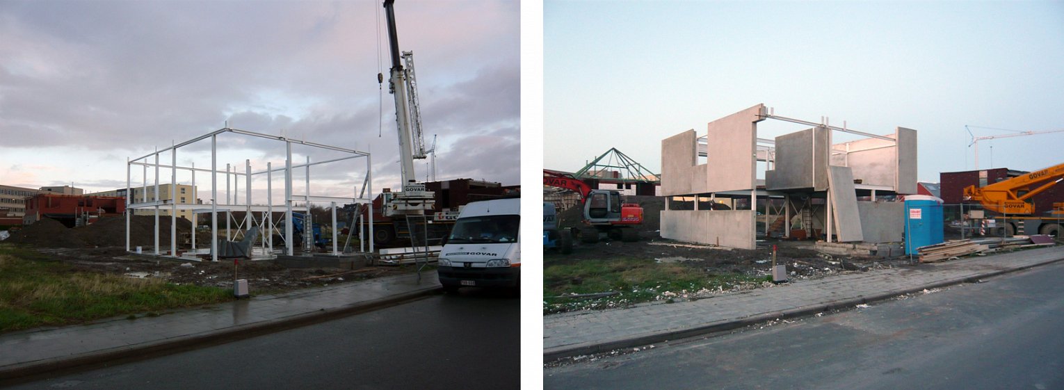 Een staalstructuur wordt bekleed met betonnen sandwichpanelen, een omhulsel dat door de eigenaars zelf ingedeeld wordt. Er is een vide voorzien ter hoogte van de leefruimte zodat de voorgevel maximaal kan beglaasd worden om het uitzicht op de polders te behouden.