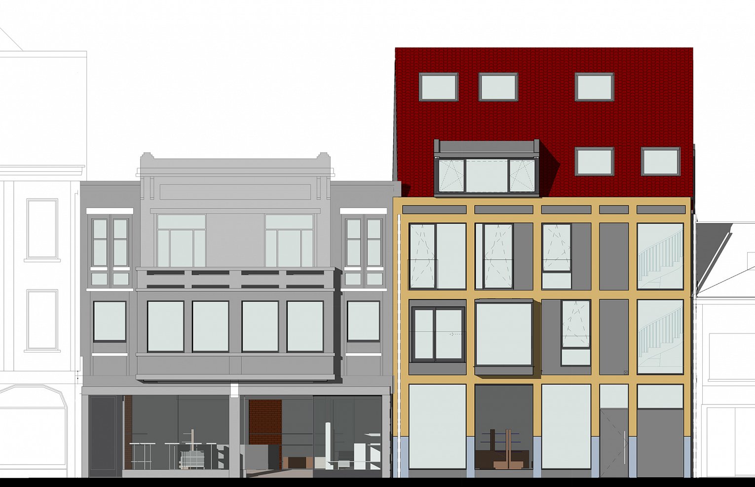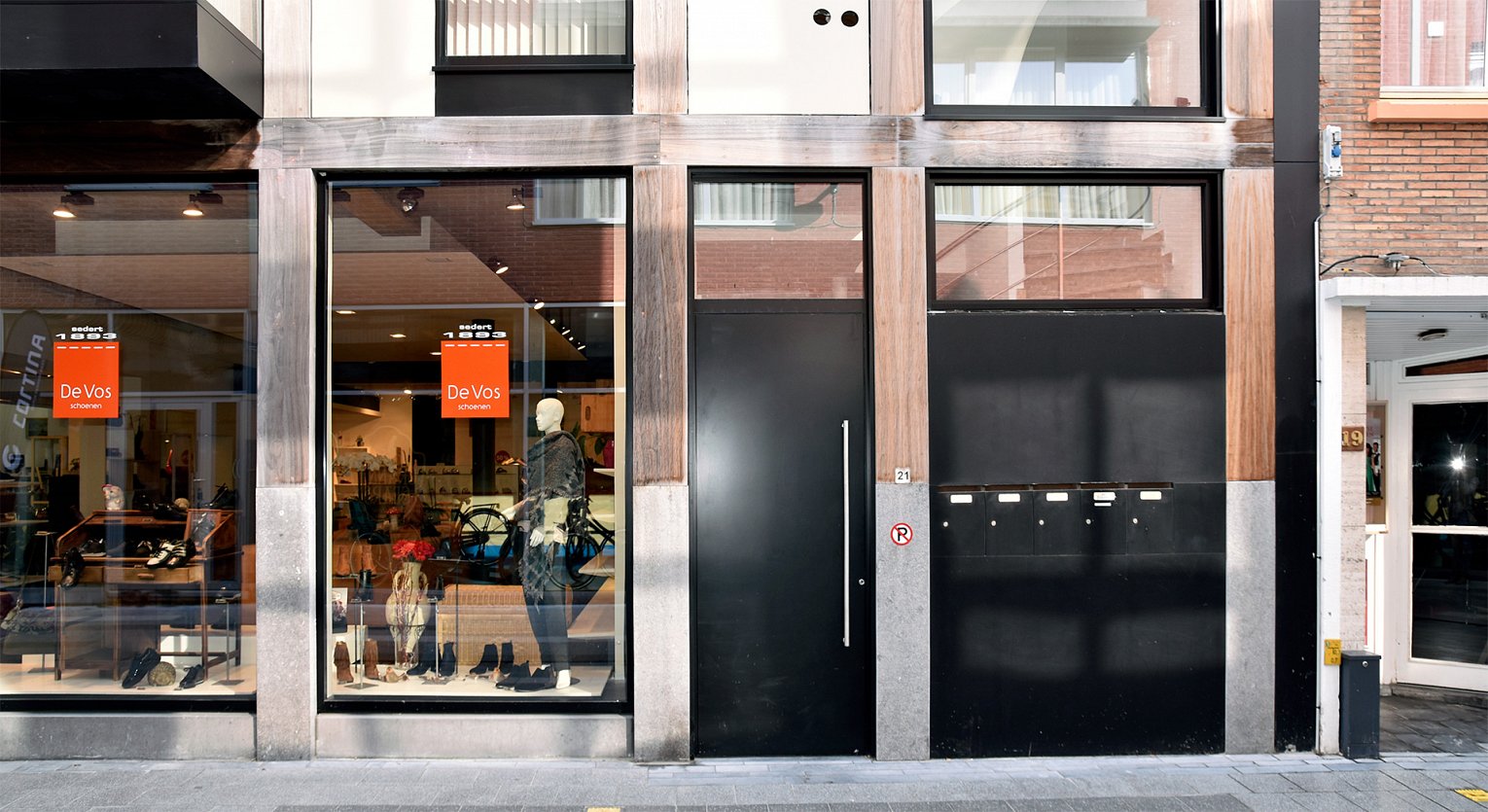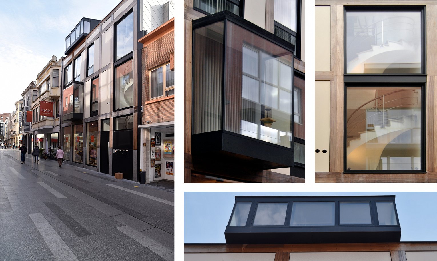 Een luxe schoenenzaak vernieuwt en bouwt aan de toekomst van de stad. De uitstraling van een mooie lederen schoen wordt in de gevel uitgedrukt door gebruik te maken van hout. Een houten gevelstructuur die veroudert en verweert met patine, gelijkaardig aan verouderend leder. Het gebouw is een moderne interpretatie van de houten vakwerkarchitectuur. De verticale circulatie wordt zichtbaar gemaakt door een elegante wentelende trap die uitkijkt op straat.