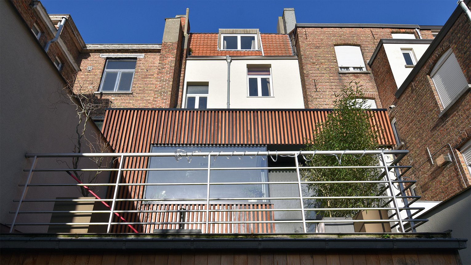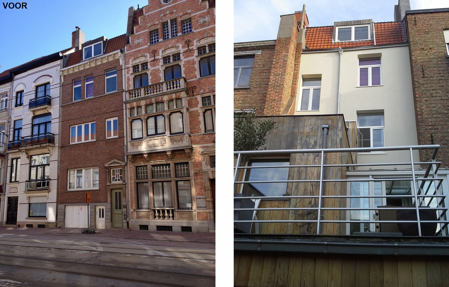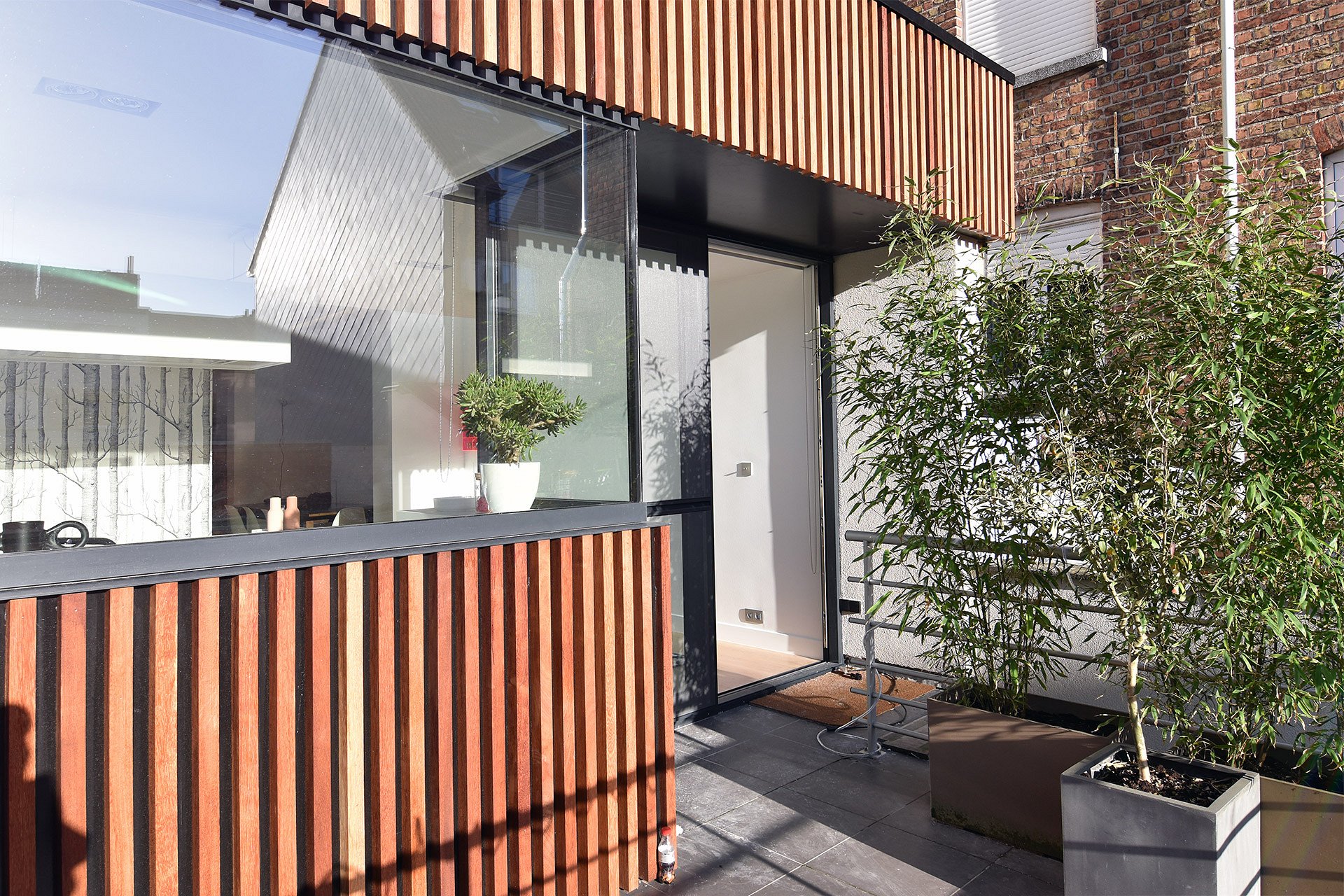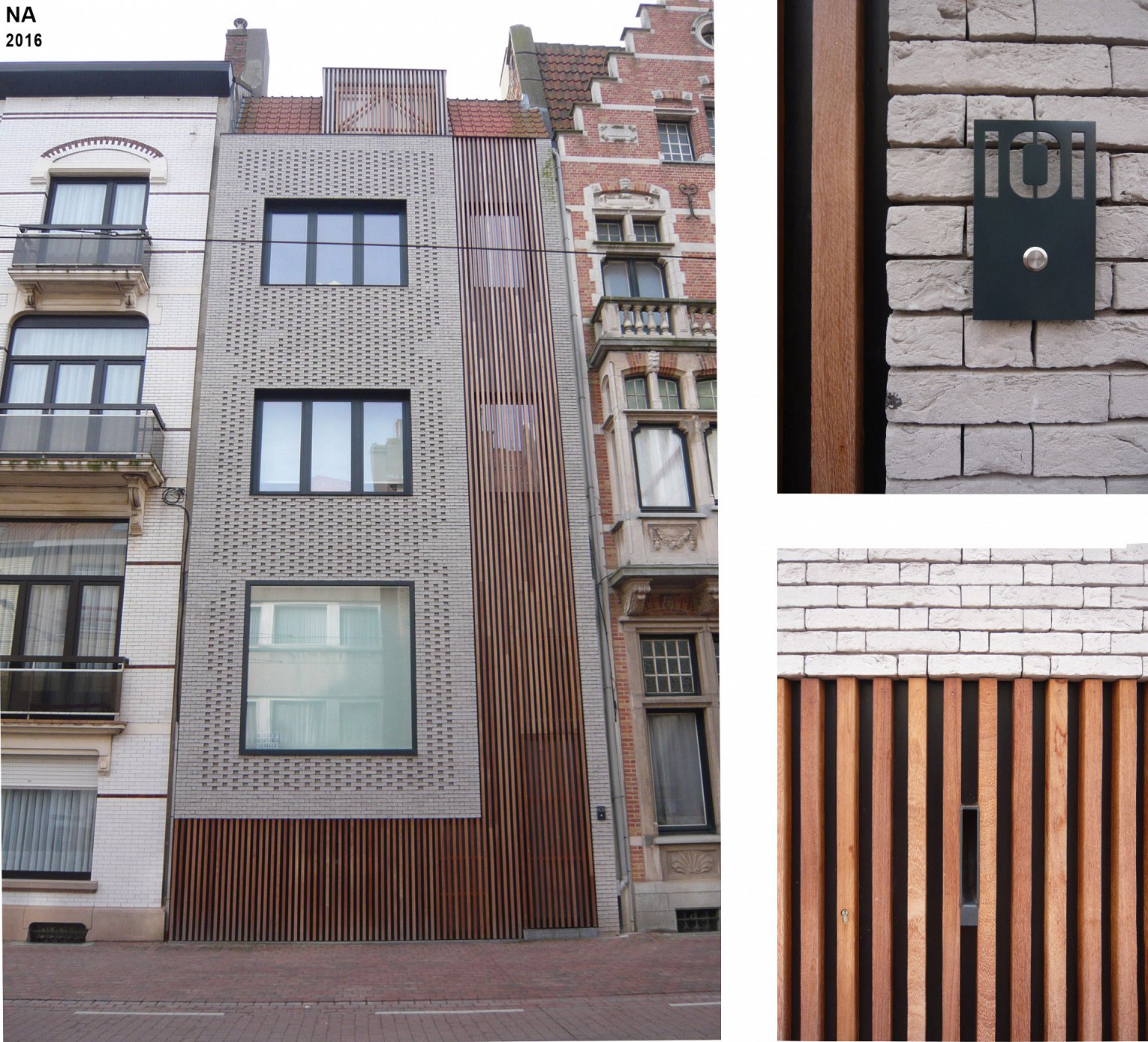 De voorgevel van de bestaande rijwoning had een grondige facelift nodig en werd geïsoleerd volgens de hedendaagse normen. De nieuwe gevelbekleding bestaat voornamelijk uit een lichtgrijze gevelsteen – type eco-brick – met een claustra-effect voor extra reliëf en anderzijds uit houten latten die doorlopen voor de raamopeningen, om zo meer rust in de gevel te brengen. De achterbouw wordt deels aangepast zodat één strak volume verkregen wordt. De bestaande achtergevel is afgewerkt in crepi. Het nieuwe volume achteraan wordt bekleed met dezelfde houten latten als de voorgevel.