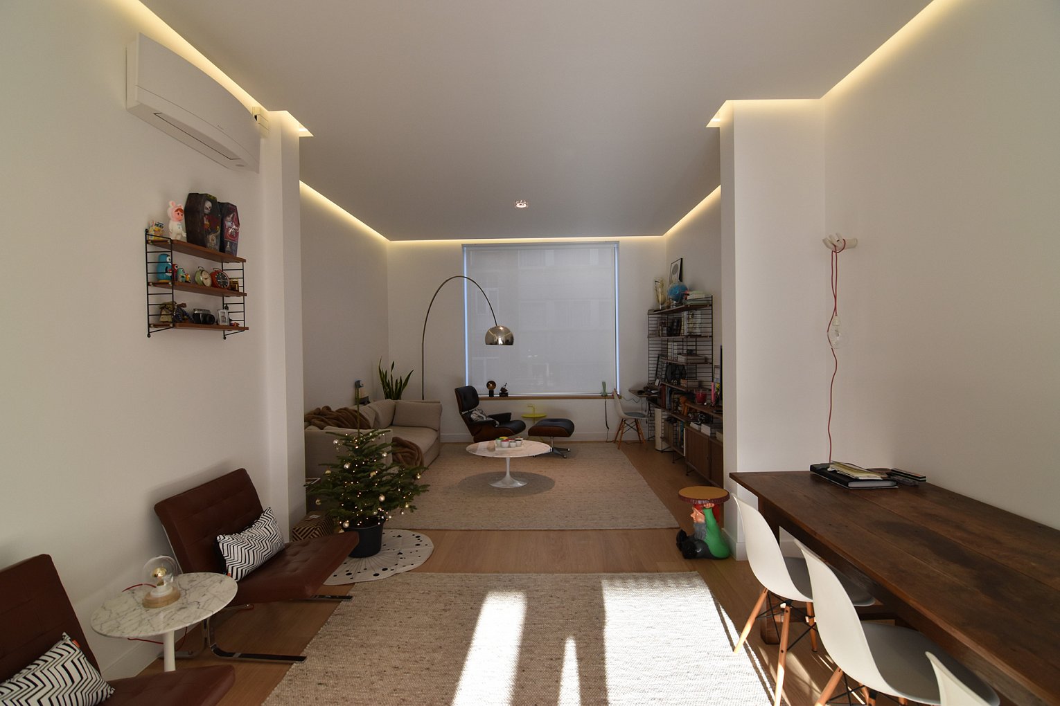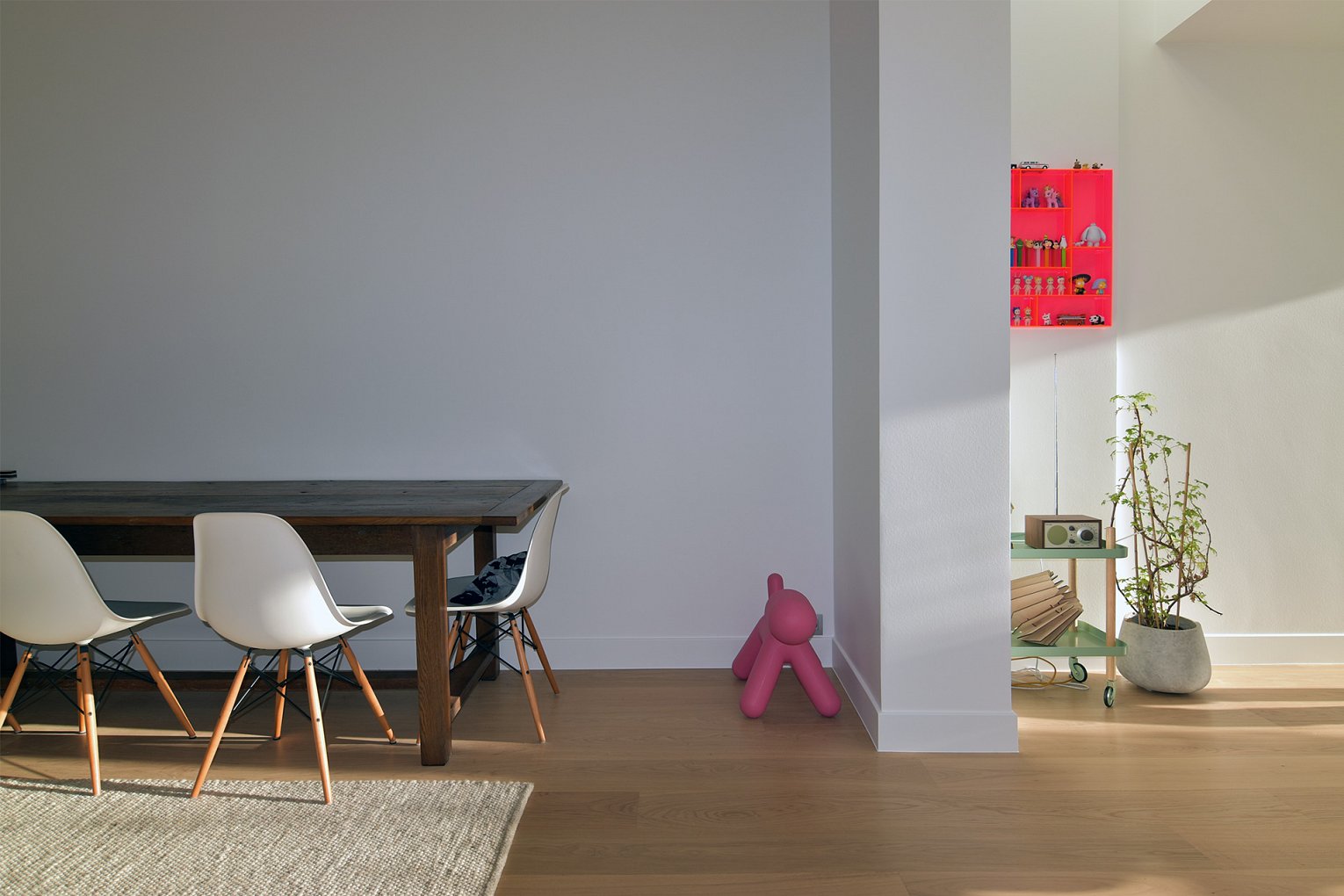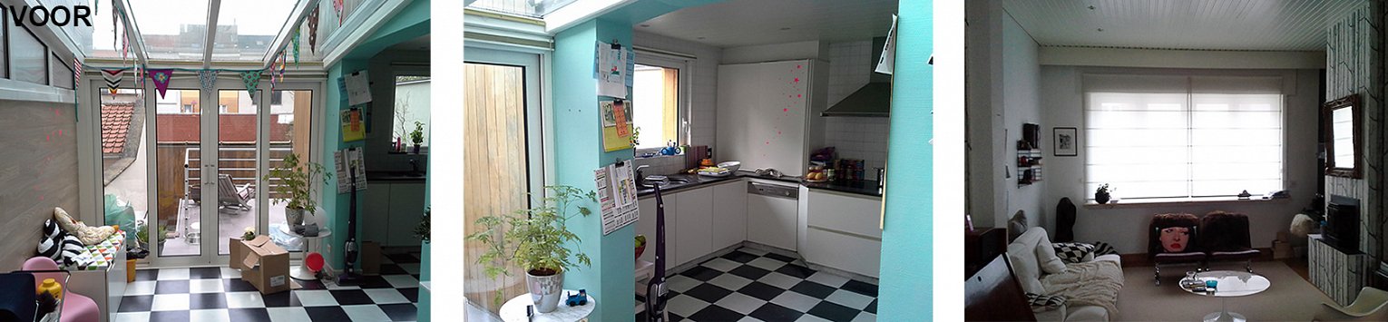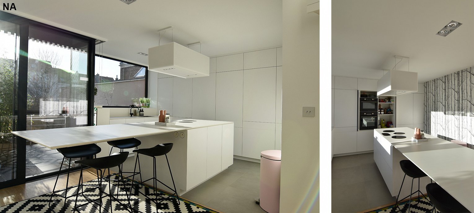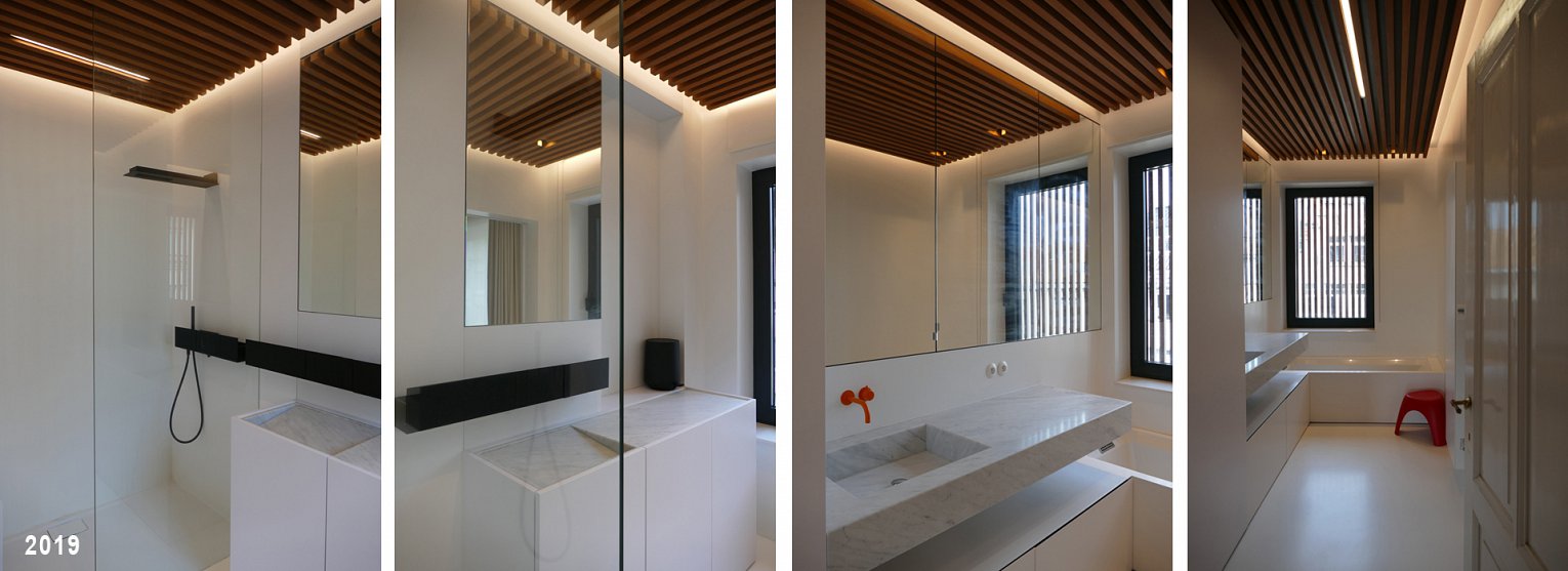 De voorgevel van de bestaande rijwoning had een grondige facelift nodig en werd geïsoleerd volgens de hedendaagse normen. De nieuwe gevelbekleding bestaat voornamelijk uit een lichtgrijze gevelsteen – type eco-brick – met een claustra-effect voor extra reliëf en anderzijds uit houten latten die doorlopen voor de raamopeningen, om zo meer rust in de gevel te brengen. De achterbouw wordt deels aangepast zodat één strak volume verkregen wordt. De bestaande achtergevel is afgewerkt in crepi. Het nieuwe volume achteraan wordt bekleed met dezelfde houten latten als de voorgevel.