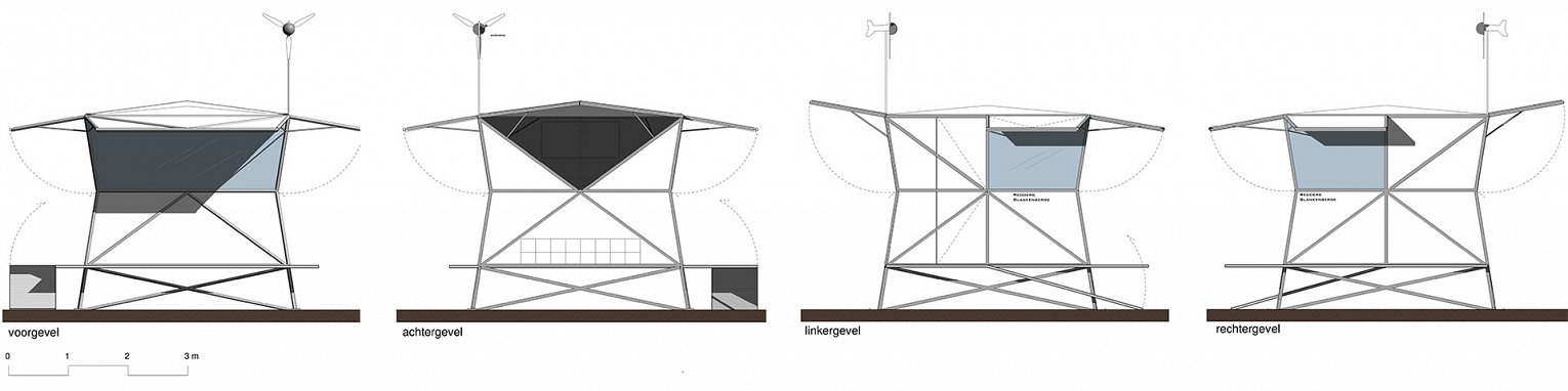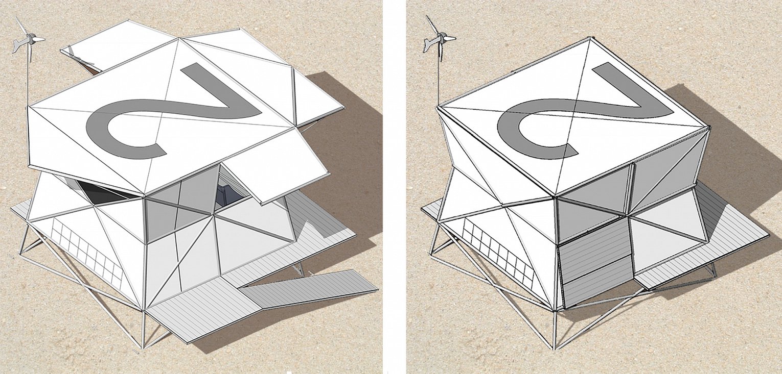 Bij gebruik kunnen verschillende delen openklappen en pivoteren om zo luifels en deuren te worden.