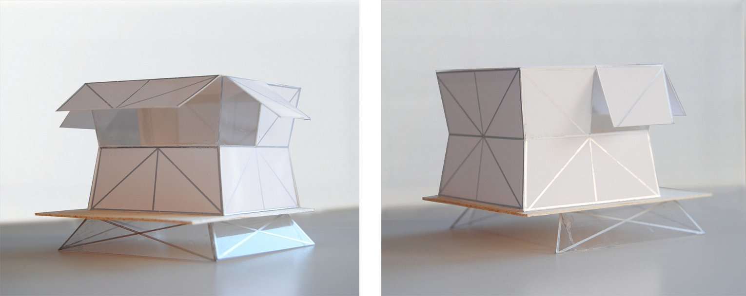 Het ontwerp is een verrassende box die in gesloten toestand de kubusvorm benadert. De constructieve elementen vormen het beeld van de box. Stijlen, regels en diagonalen. Als een diamant wordt het paviljoen gepresenteerd op een blaadje.