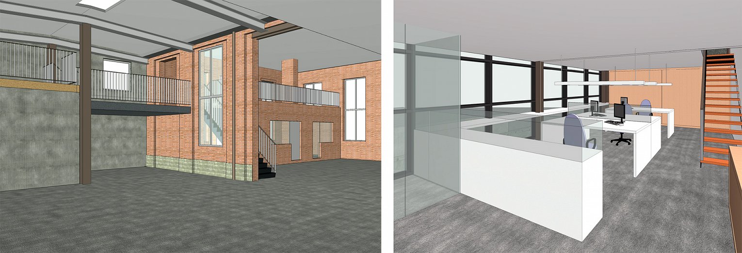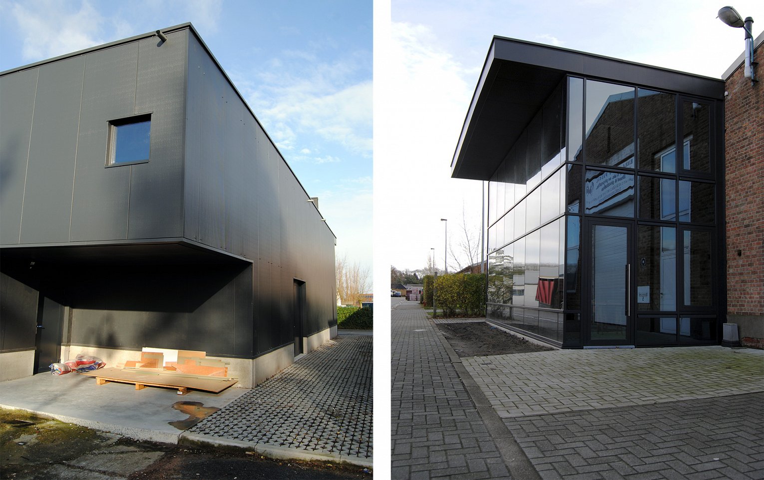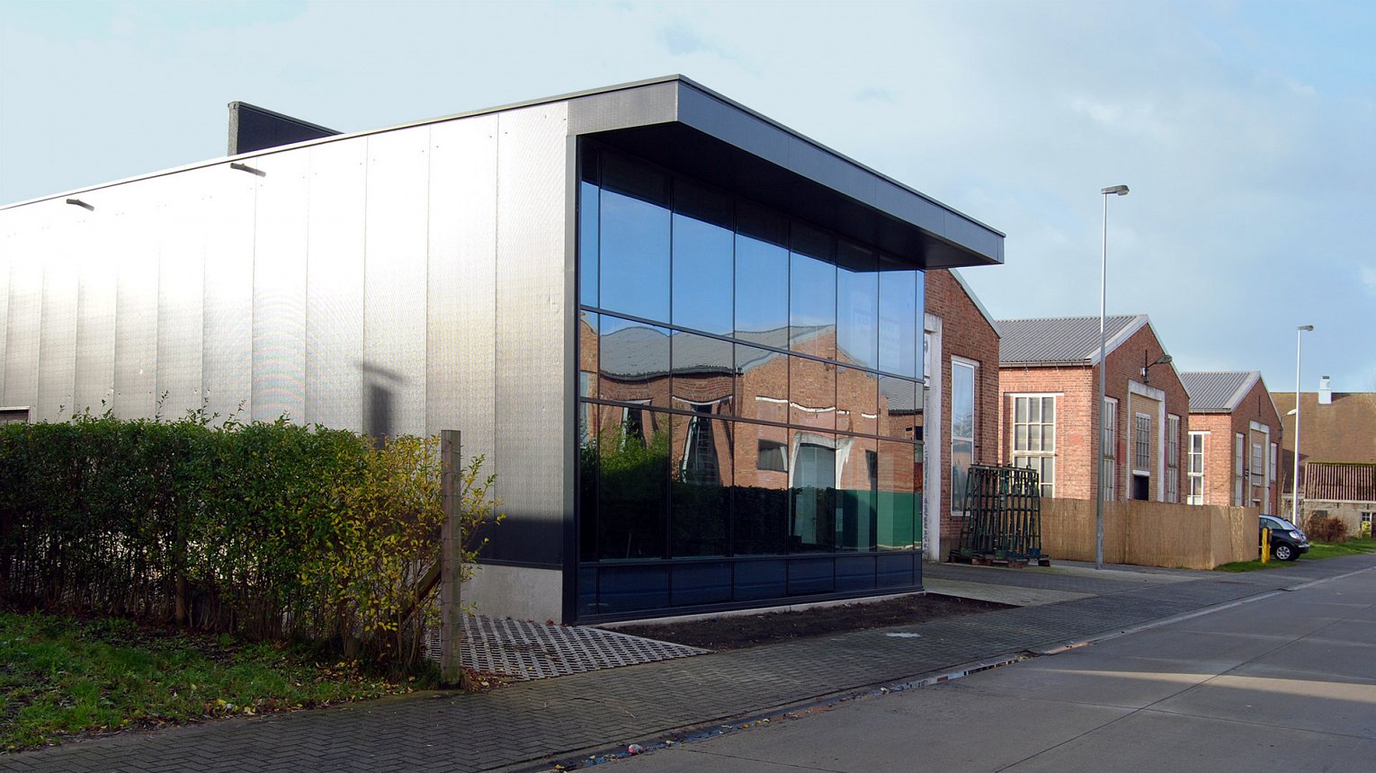 Een voormalige militaire site werd omgevormd tot bedrijvencentrum. De uitbreiding van één van de bedrijfsgebouwen werd uitgewerkt als een strakke lichte constructie. De volledig beglaasde gevel reflecteert de uniforme militaire gebouwen waardoor de moderne constructie opgenomen wordt in de omgeving.