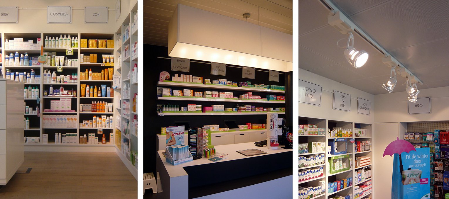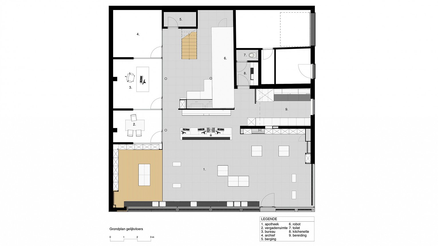 Een bankkantoor werd omgebouwd tot moderne apotheek. Door integratie van een robot als stockageruimte voor medicamenten werd een apotheek gecreëerd die het mogelijk maakt alle aandacht naar de klant te oriënteren. De publieksruimte is een flexibele invulling met verplaatsbare elementen.