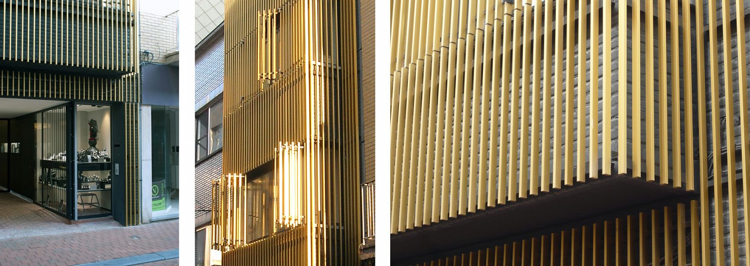 Een bestaande banale gevel werd omgevormd tot een attractief en intrigerend lijnenspel die de functie van de winkel als juwelenzaak benadrukt.