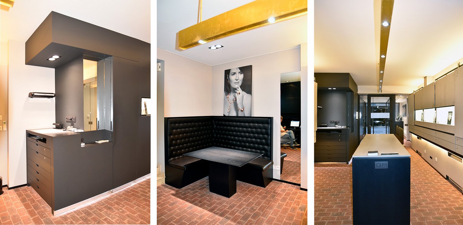 De juwelierszaak werd ontworpen als een open werkplaats, geen balie maar een centrale tafel. Het bureau van de zaakvoerders bevindt zich in de publieksruimte, zo ook een vergadertafel met zitbanken rondom die een huiselijk gevoel uitstraalt.