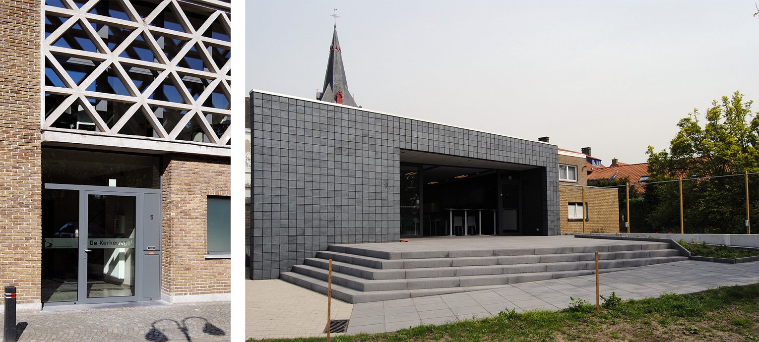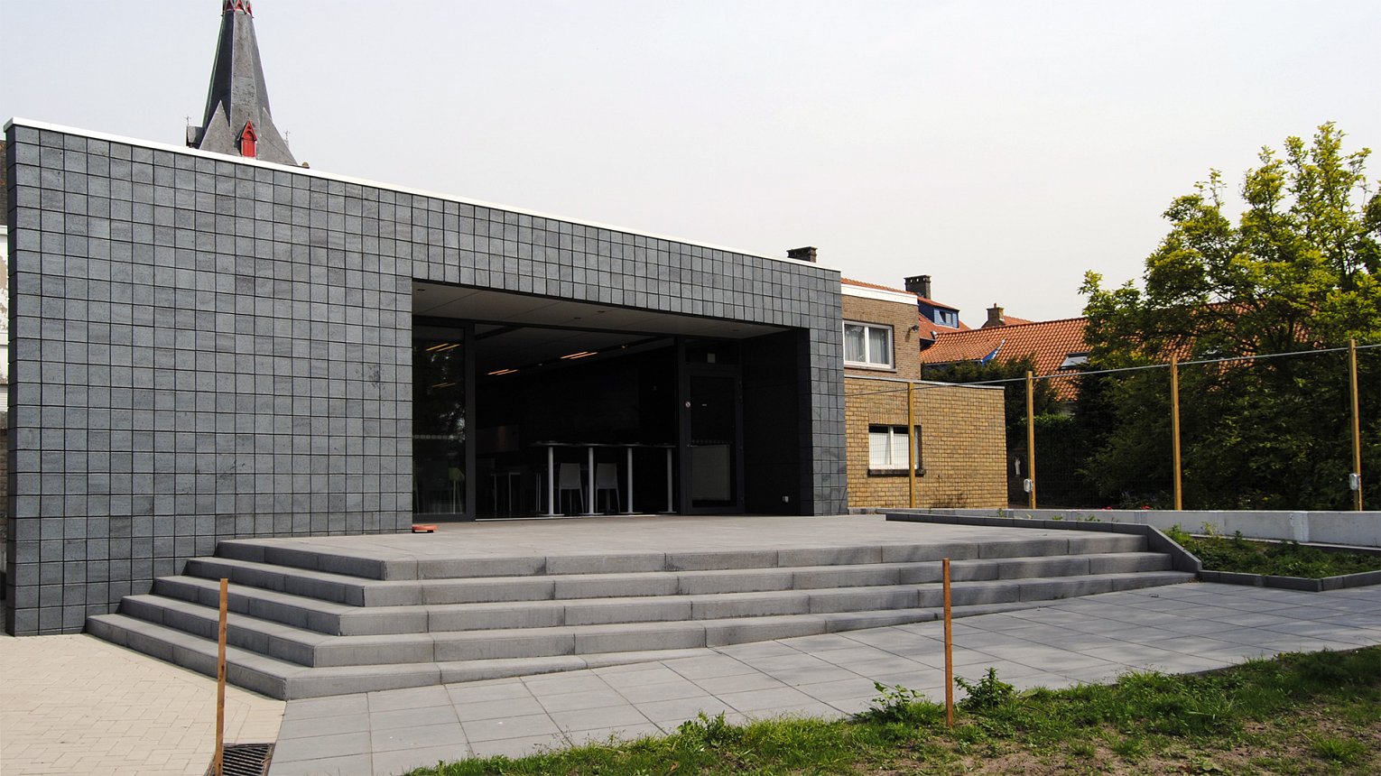 De bestaande parochiezaal wordt verbouwd en ingericht tot een multifunctionele en hedendaagse ontmoetingsruimte. De achtergevel wordt in zijn totaliteit gezien als een wand op zich, die wordt uitgevoerd met een geperforeerde strengperssteen. De gevel laat zich ervaren als robuust en massief maar krijgt toch een zekere openheid door een volledig beglaasde uitsnijding te voorzien van 6.3 x 2.8m.