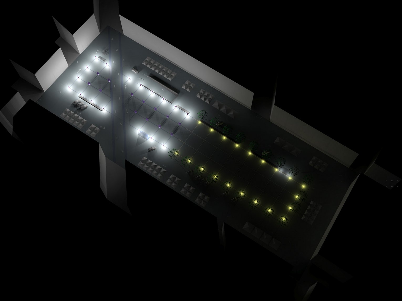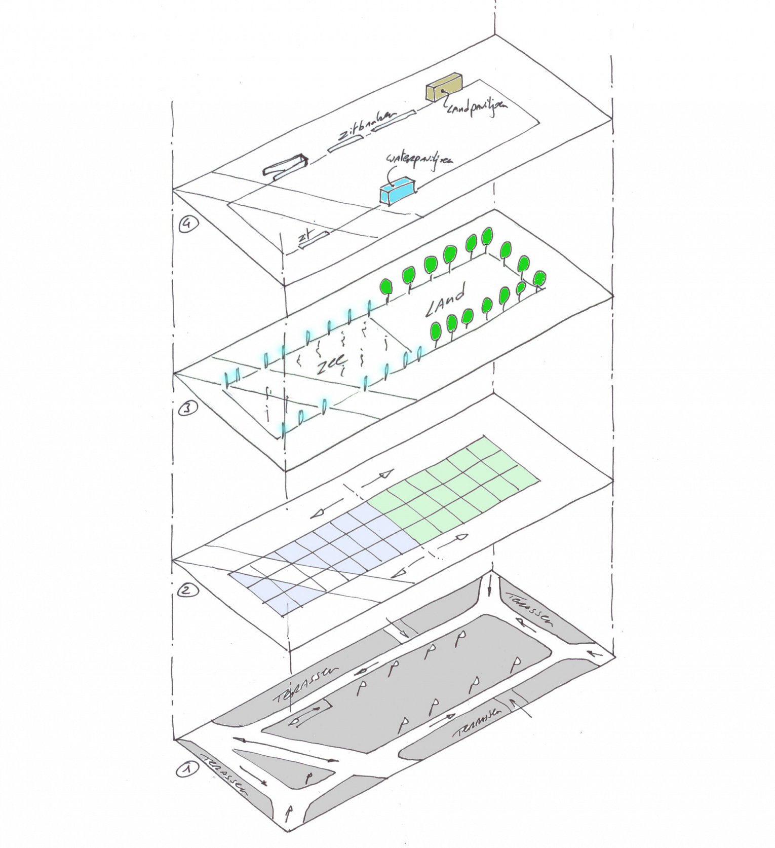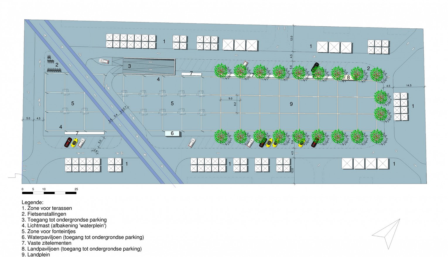 Het eigenlijke nieuwe centrale plein wordt opgesplitst volgens de toepasselijke thema’s ‘water en land’ met elk hun aandachttrekkende paviljoenen die toegang geven tot de ondergrondse garages.